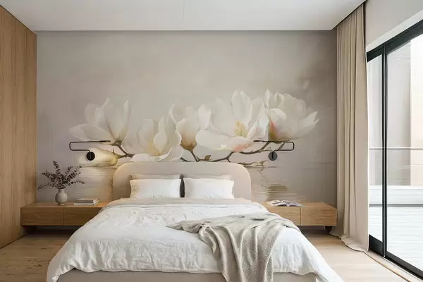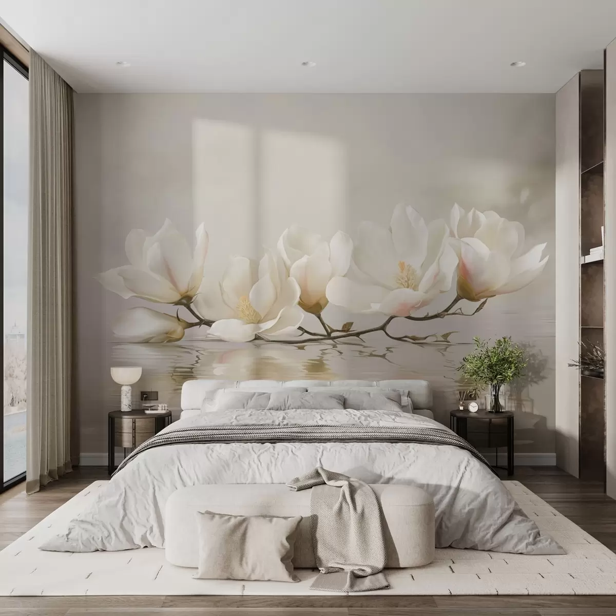 Фотошпалери Легкі квіти магнолії на гілці над віддзеркаленням води w05353