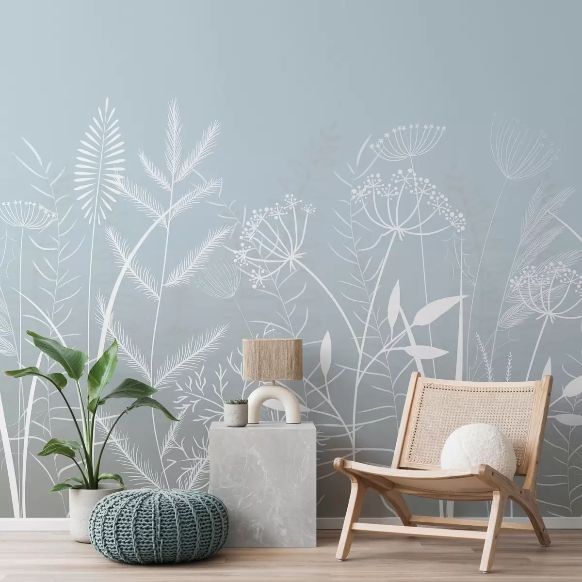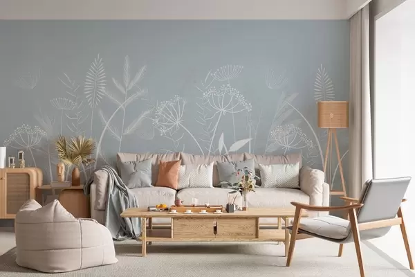 Фотошпалери ніжні, розписані вручну дикі трави та квіти на сіро-блакитному тлі w05383