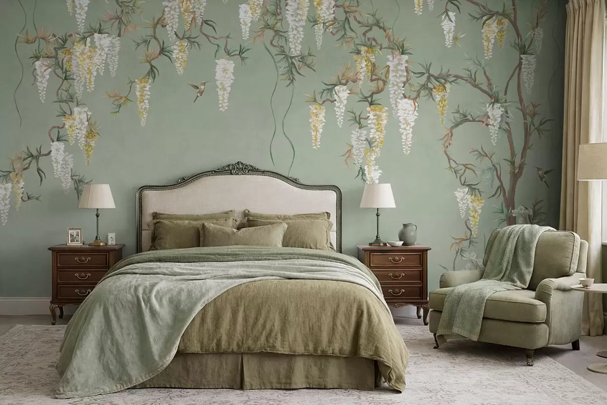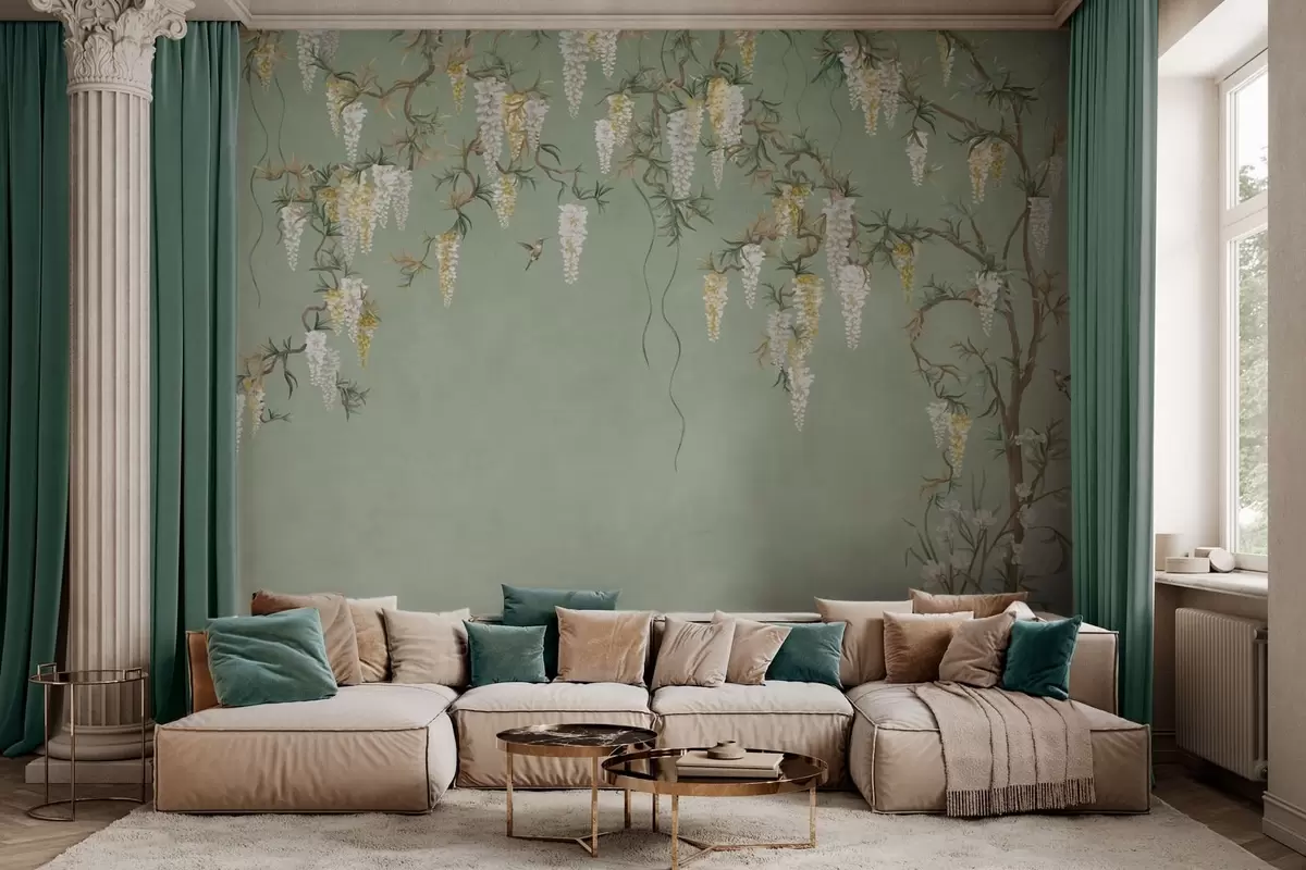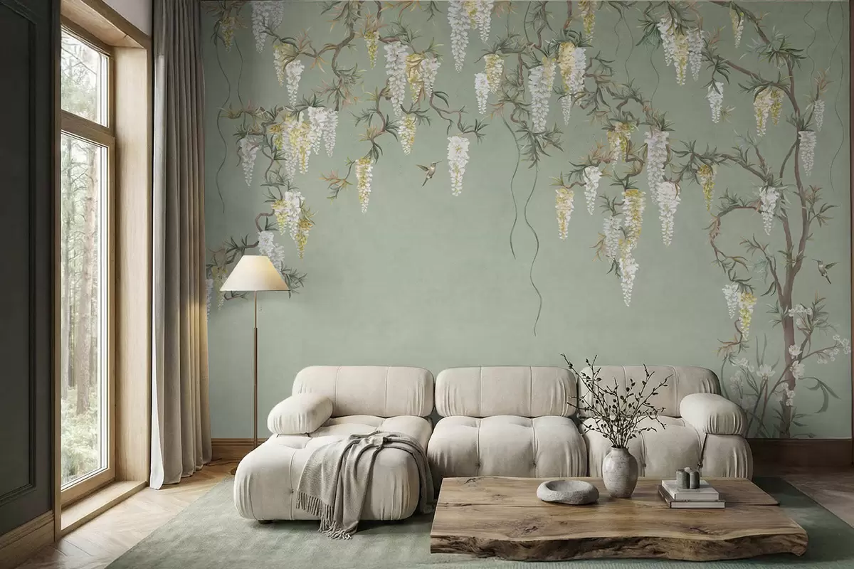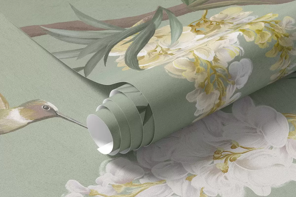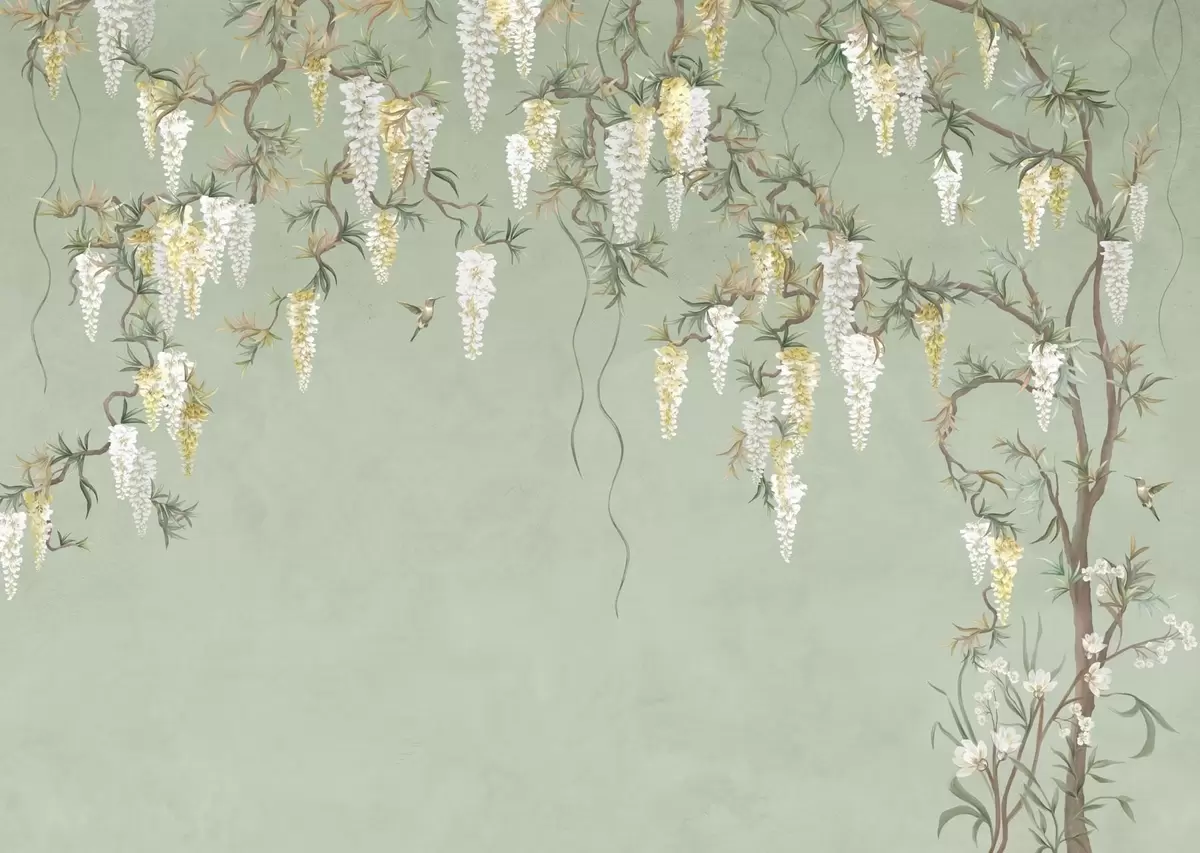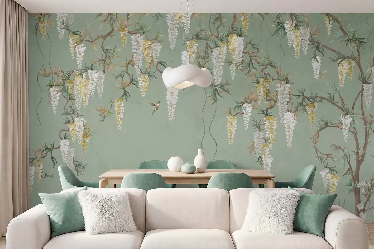 Фотошпалери Квітучі гілки з білими квітами та птахами на зеленому тлі w05394