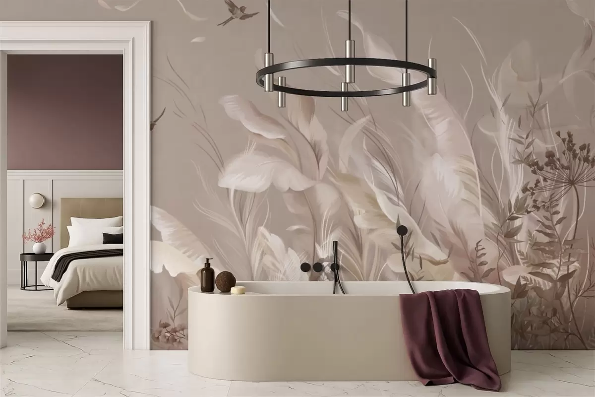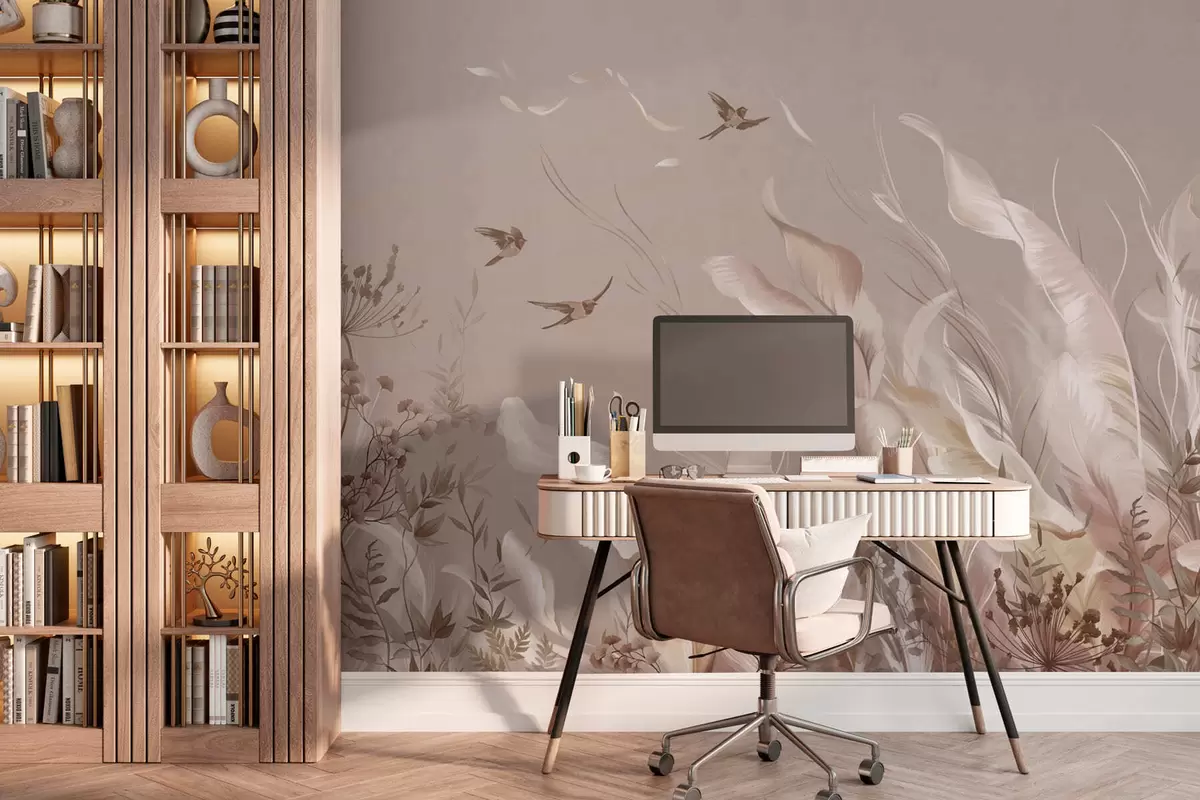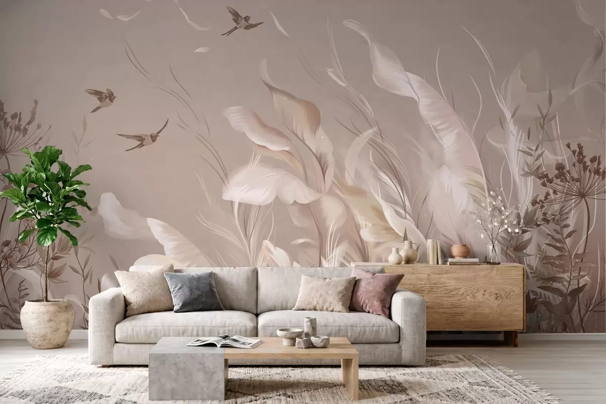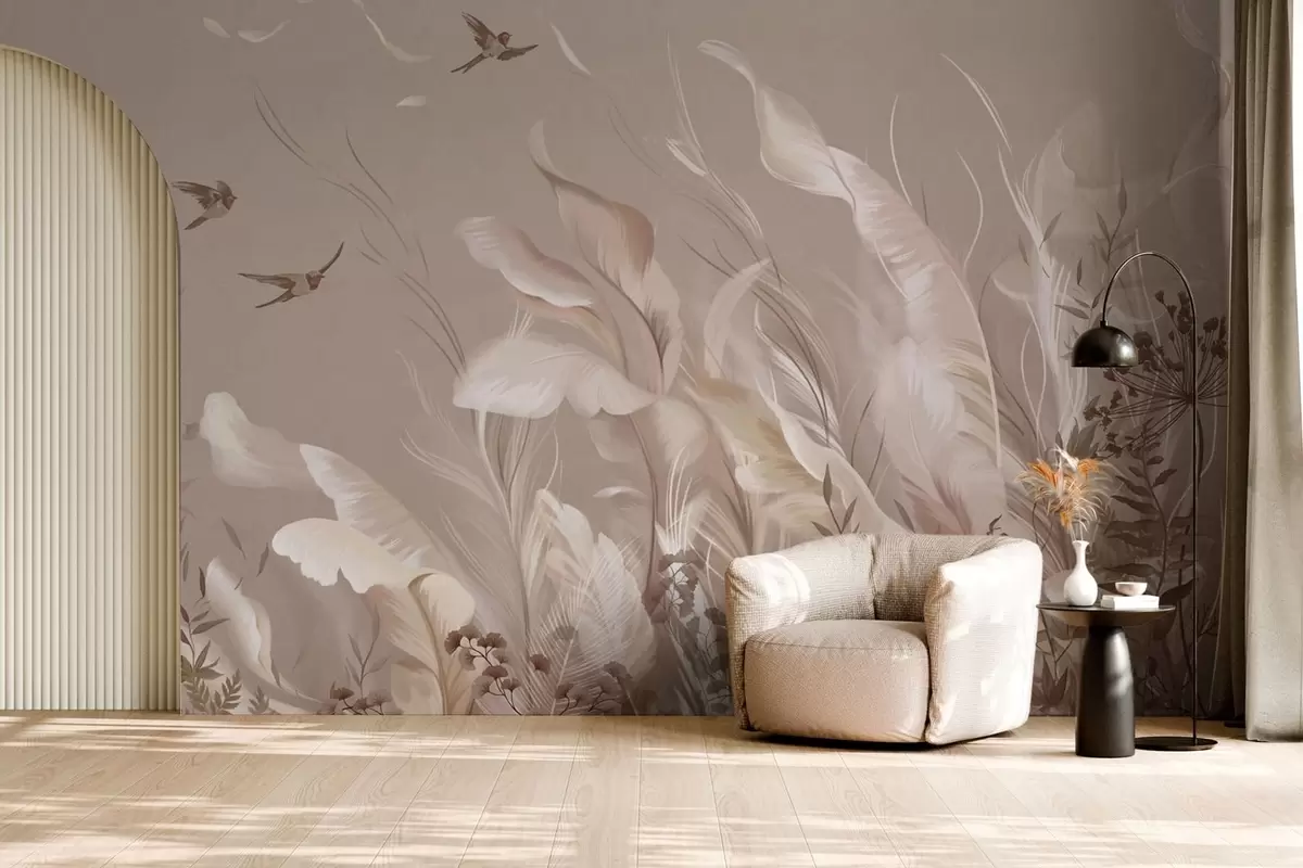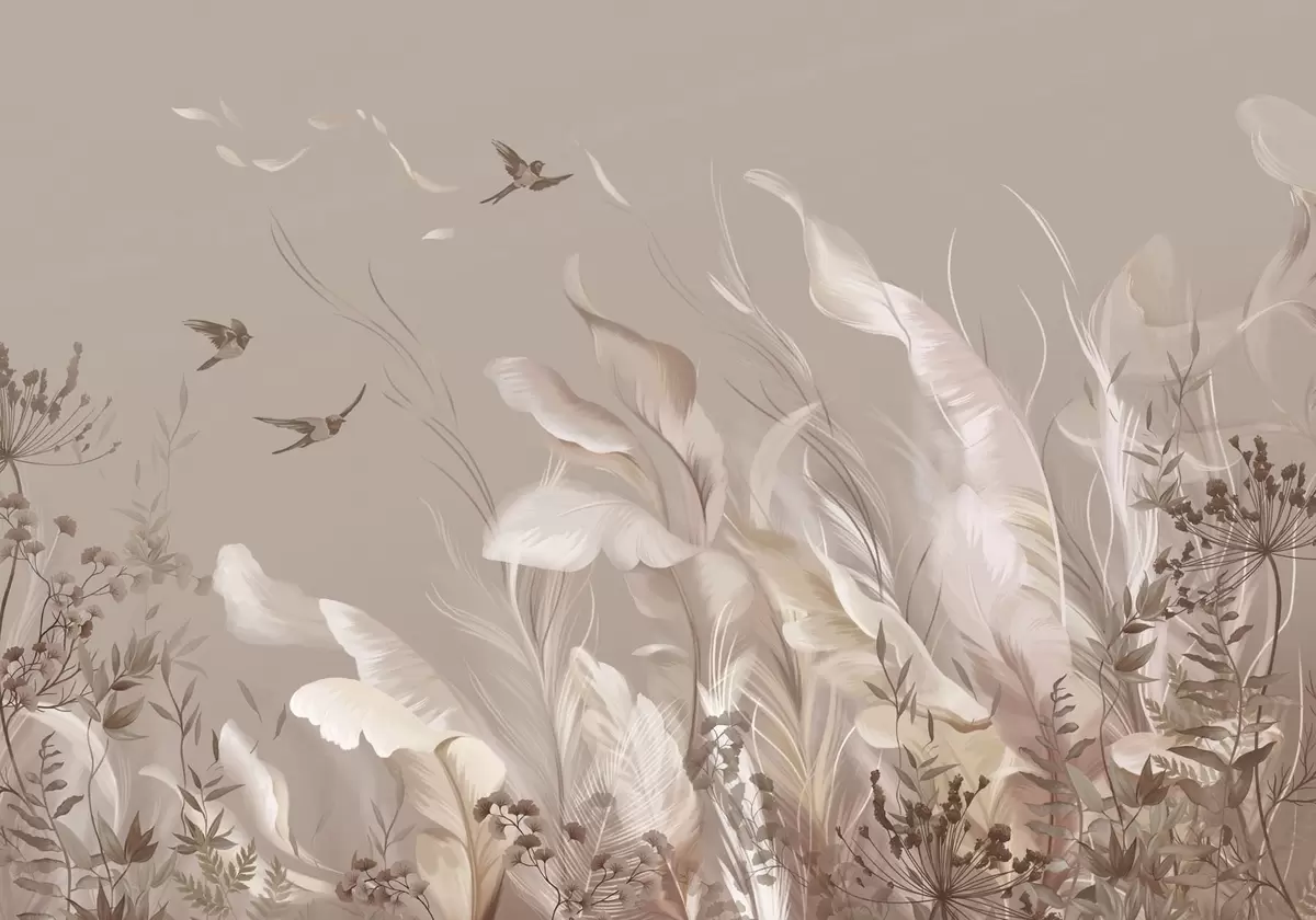 Фотошпалери Легкі пір'я та рослини з птахами у пастельних тонах w05395v1