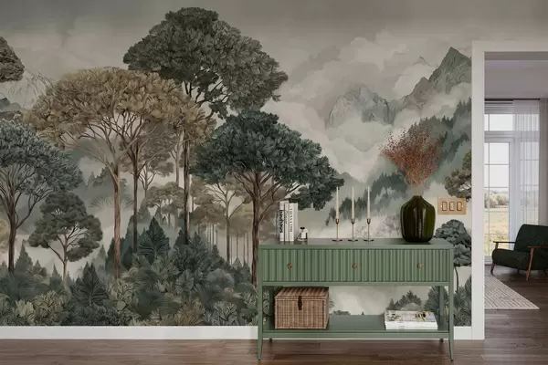 Фотошпалери Гірський пейзаж з лісом у ніжних тонах w05410v1