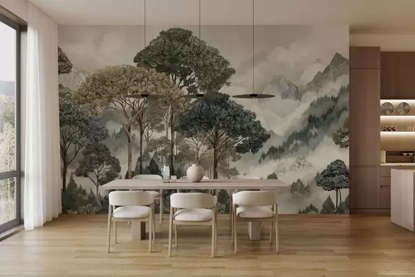 Фотошпалери Гірський пейзаж з лісом у ніжних тонах w05410v1
