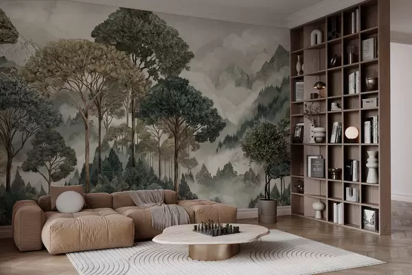 Фотошпалери Гірський пейзаж з лісом у ніжних тонах w05410v1