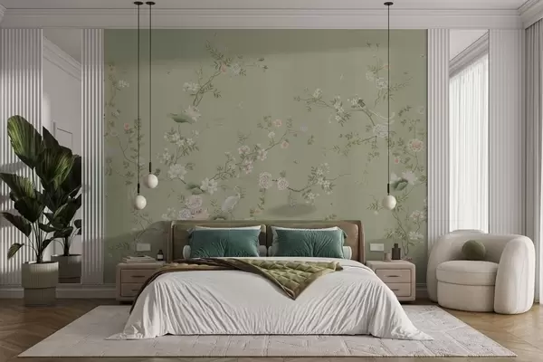 Фотошпалери Квітучі гілки з птахами на світло-зеленому тлі w05416