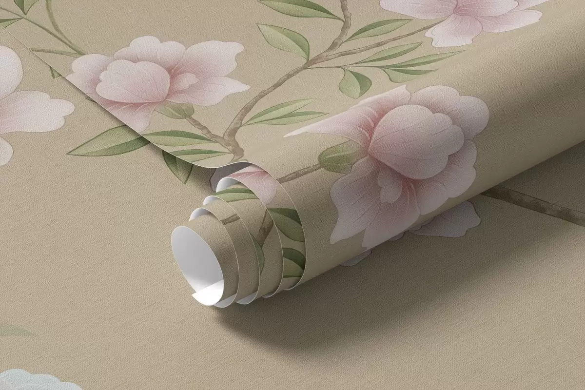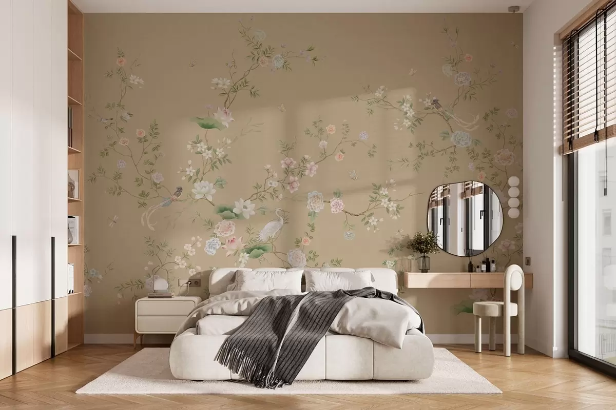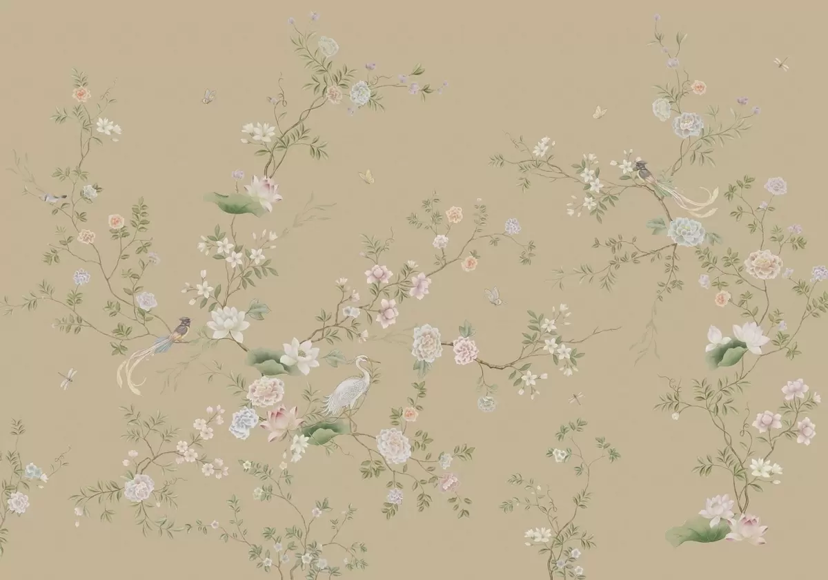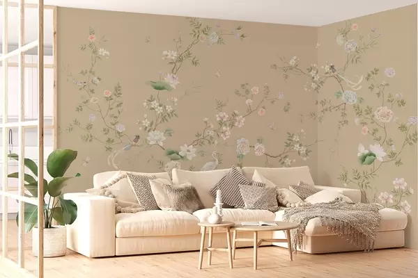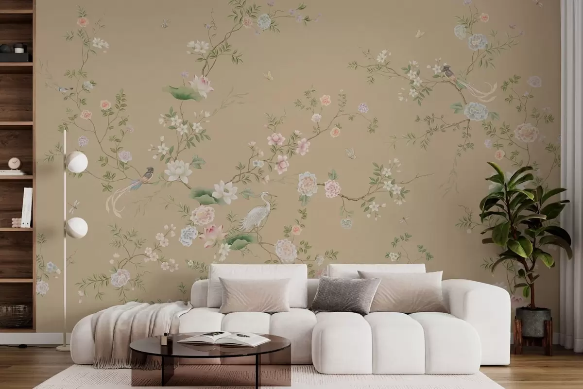 Фотошпалери Квітучі гілки з птахами на тлі теплого бежевого кольору w05416v2