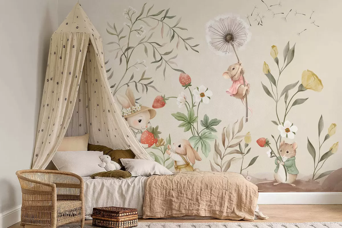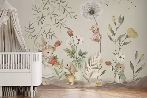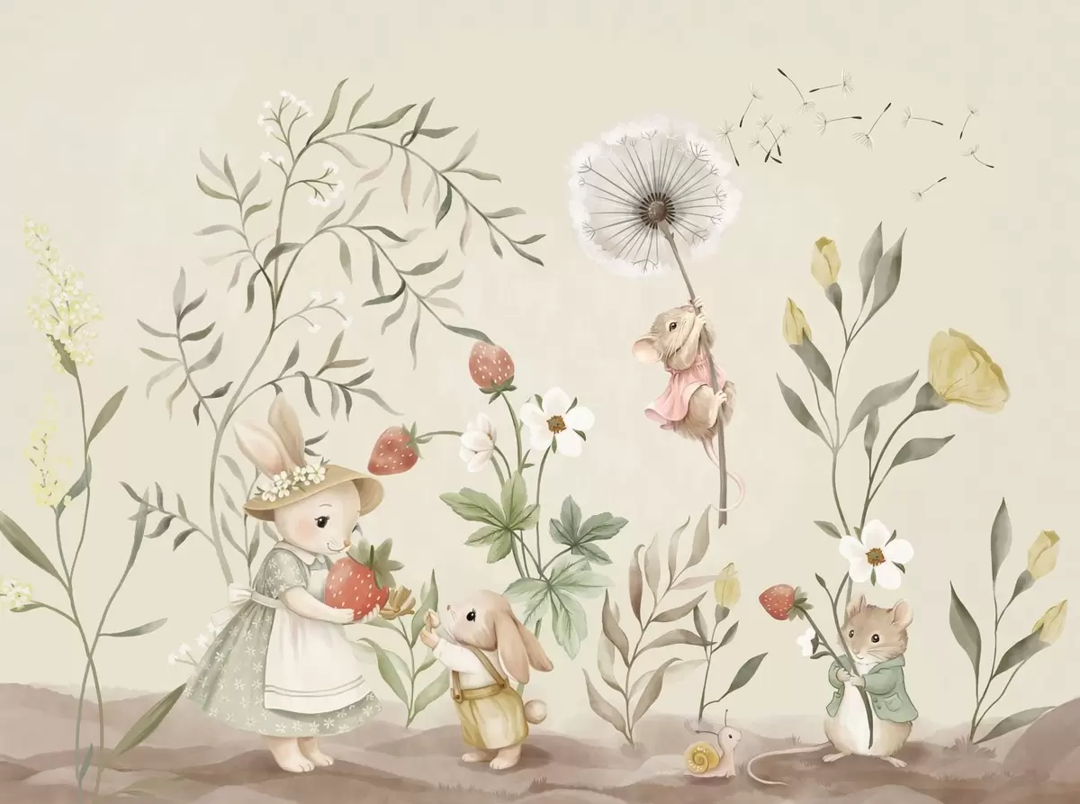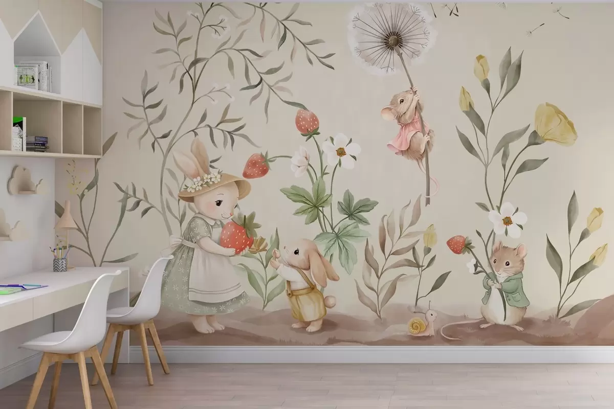 Фотошпалери Ілюстрація кролика, мишки та рослин із полуницями w05422v2