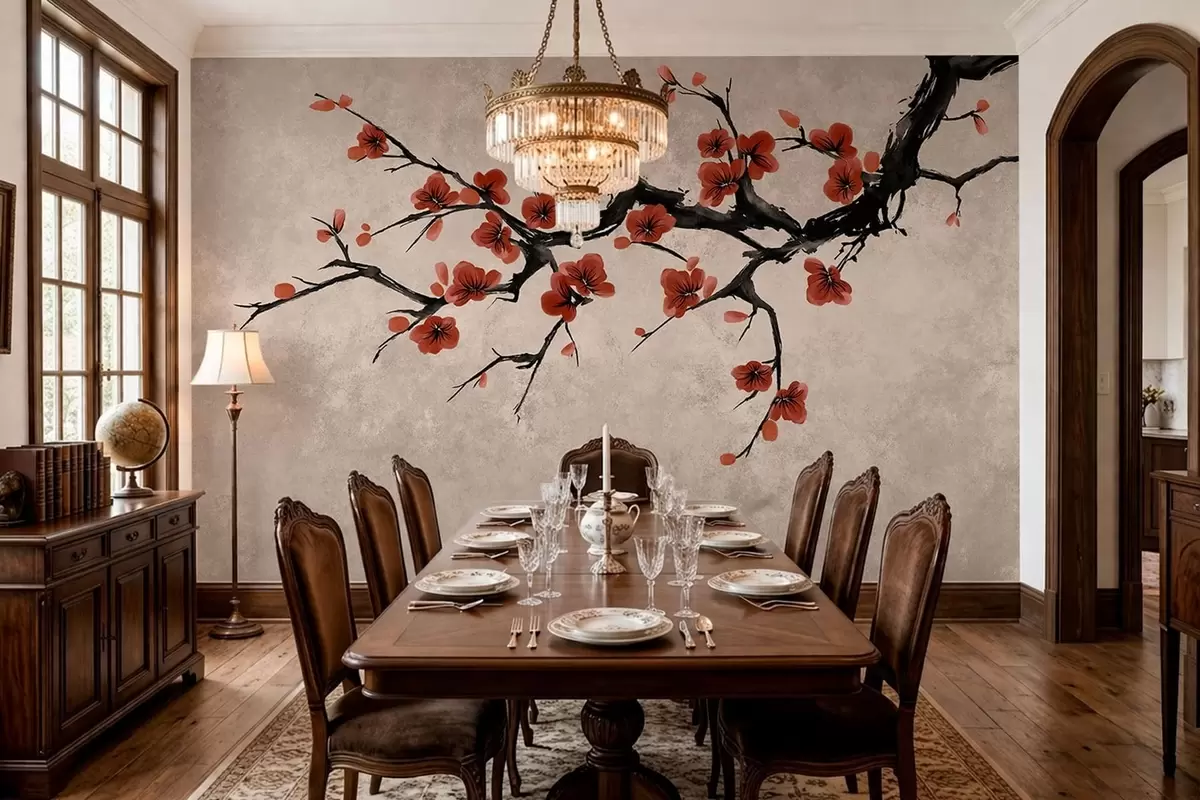 Фотошпалери Гілка з квітами у східному стилі на бежевому тлі w05425v4