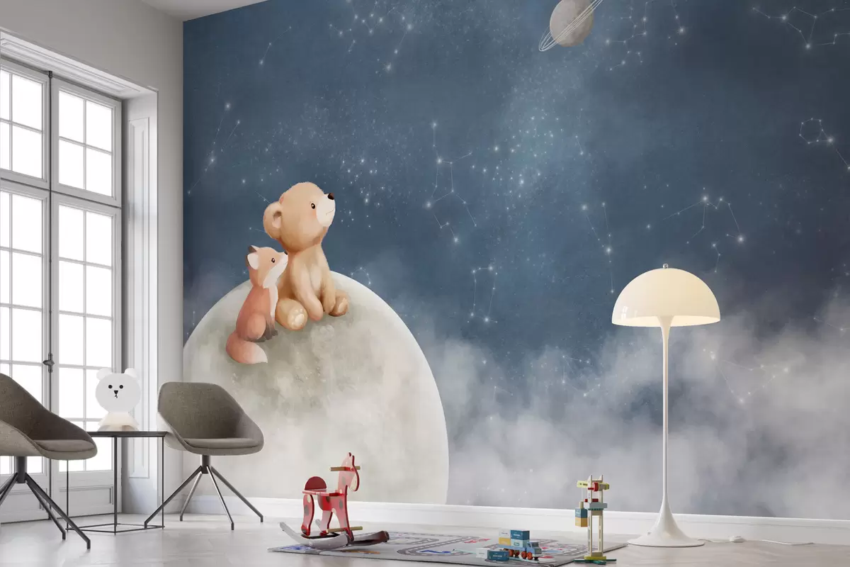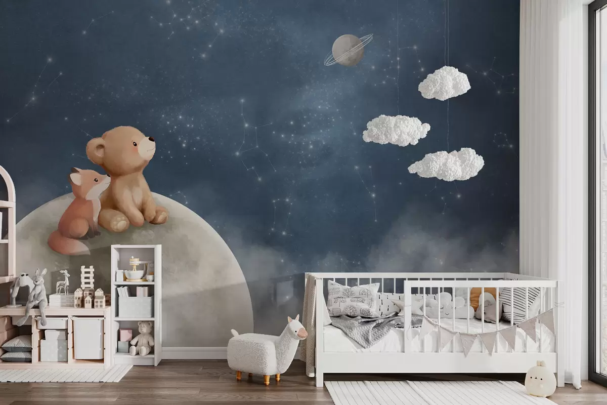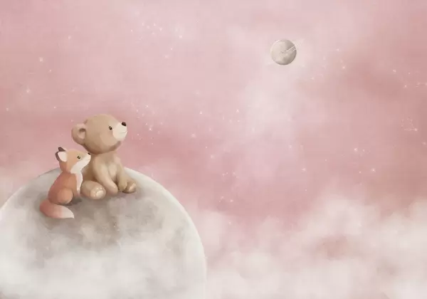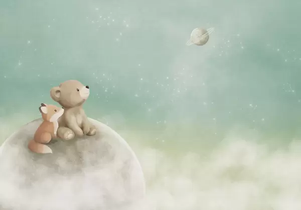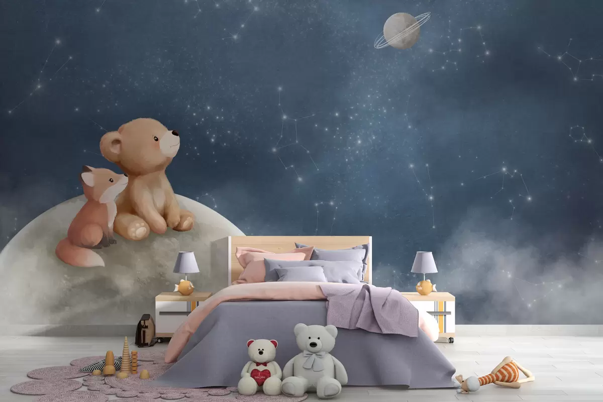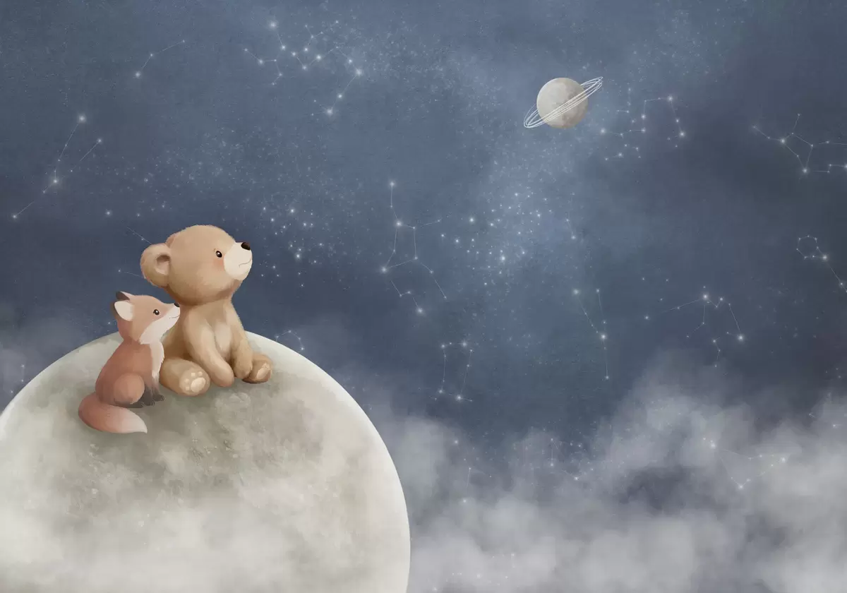 Фотошпалери Пастельна ілюстрація: ведмідь і лисиця на тлі нічного неба w05431