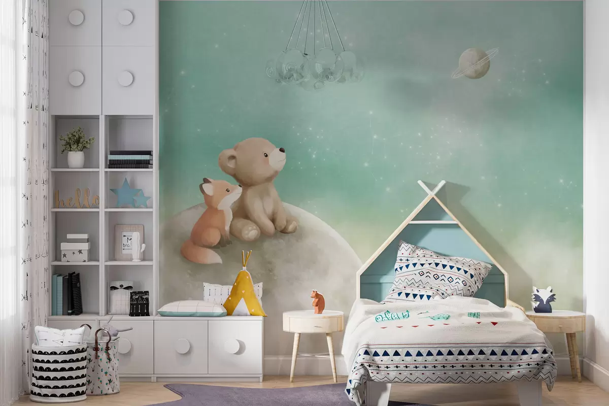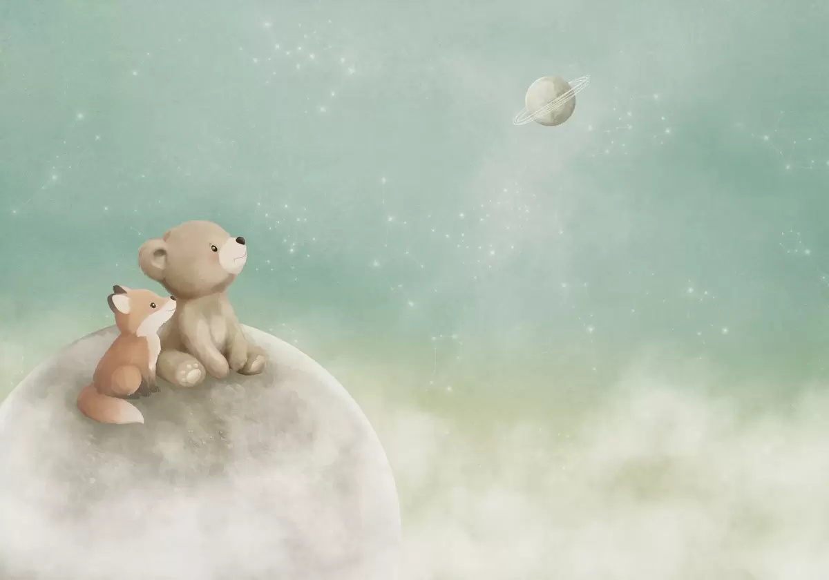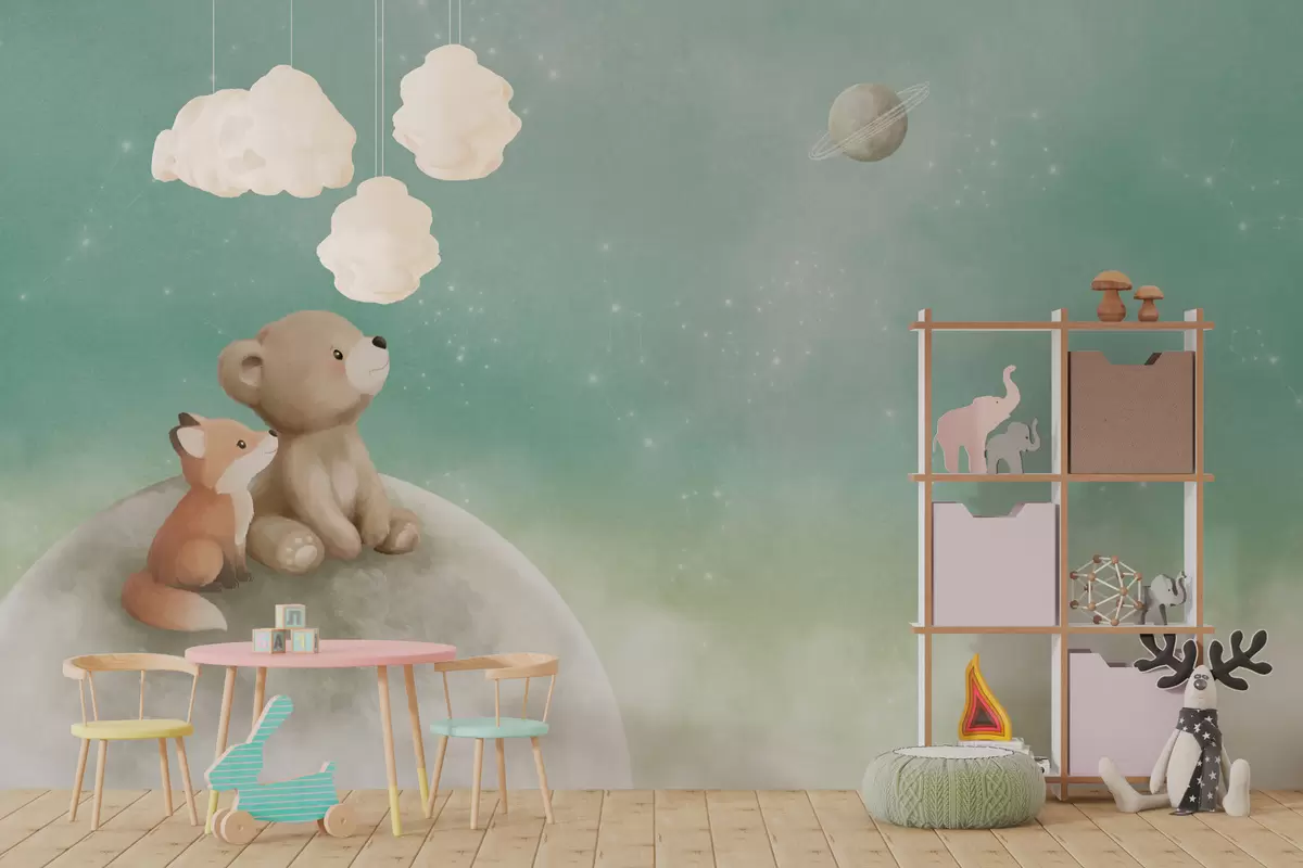 Фотошпалери Пастельна ілюстрація: ведмідь і лисиця на тлі зеленого неба w05431v1