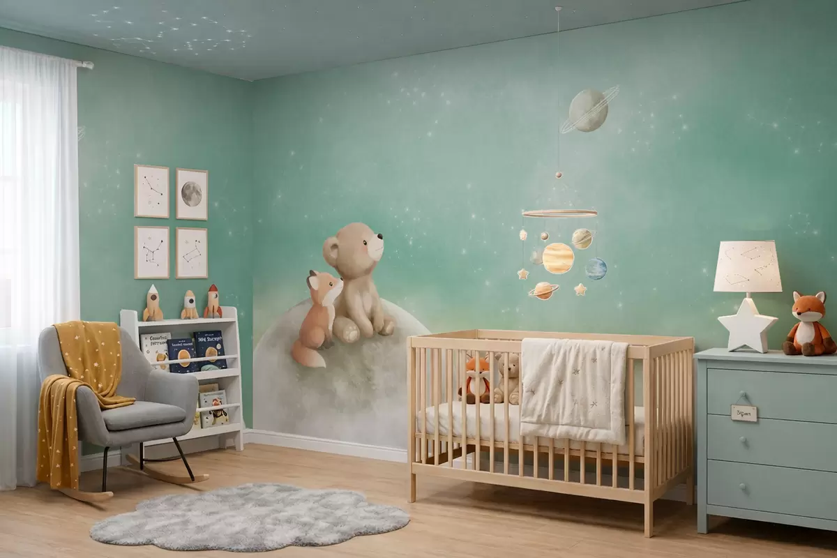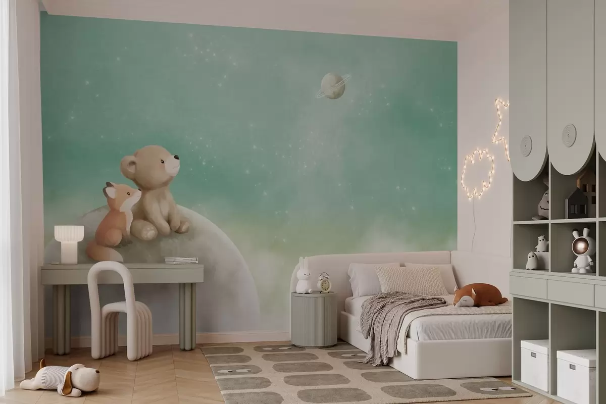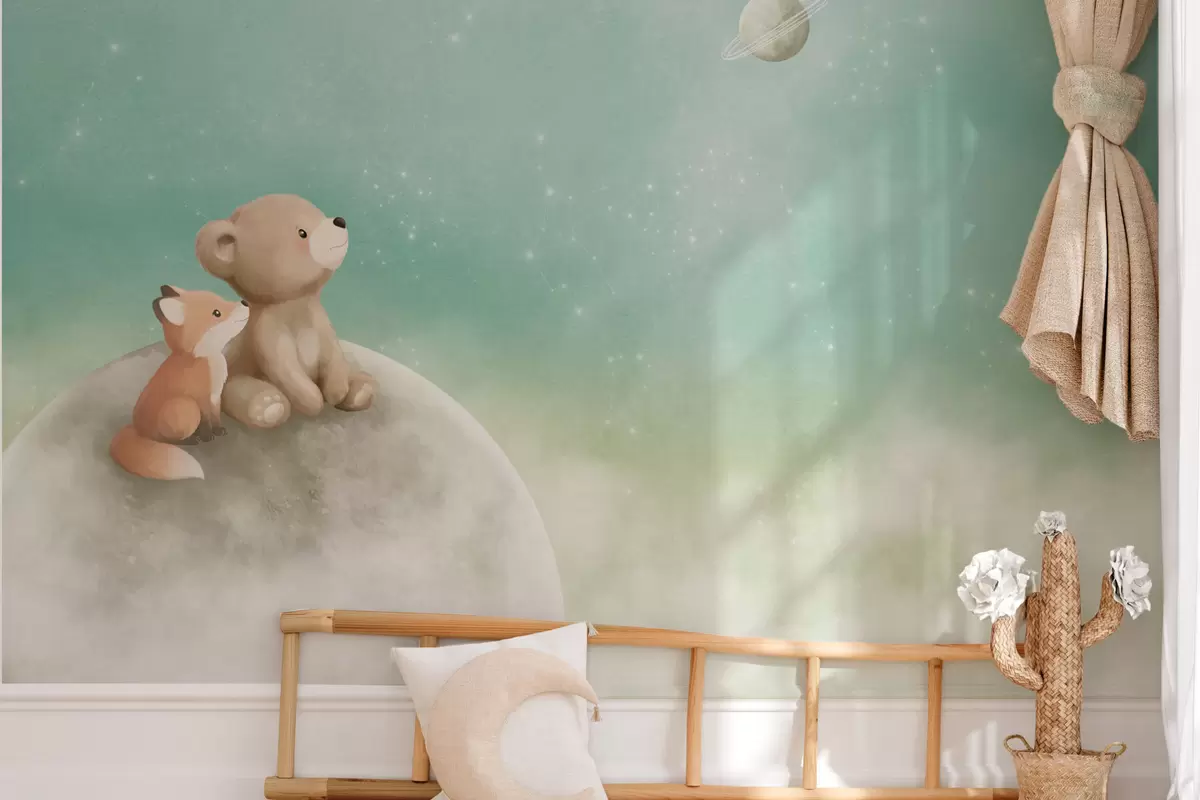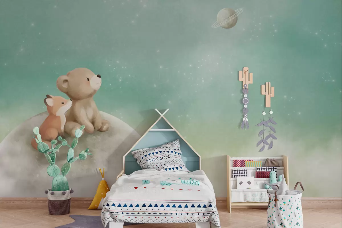 Фотошпалери Пастельна ілюстрація: ведмідь і лисиця на тлі зеленого неба w05431v1