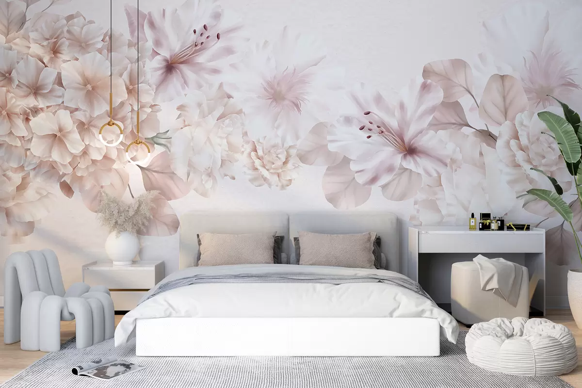 Фотошпалери Ніжно-рожева та біла квіткова композиція з ніжними пелюстками та квітами на світлому фоні w07923