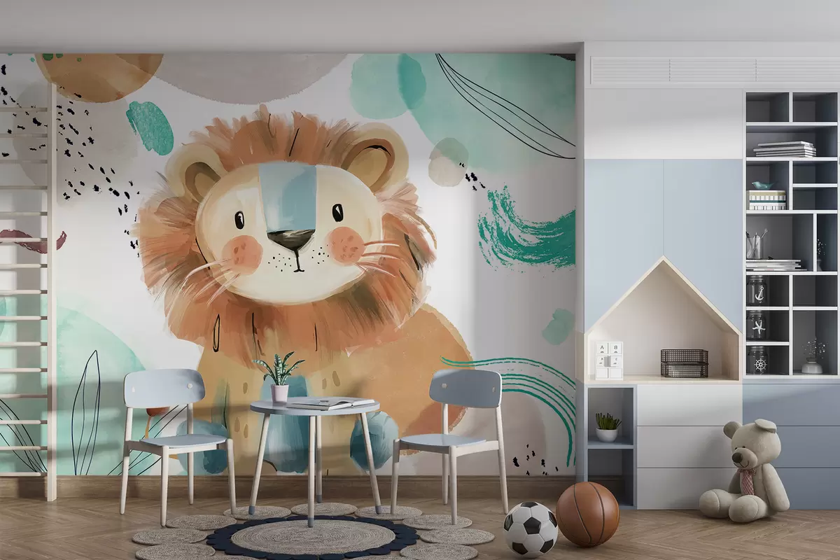 Фотошпалери Милий мультяшний лев на барвистому абстрактному фоні з мазками пензля та бризками пастельних кольорів w07924