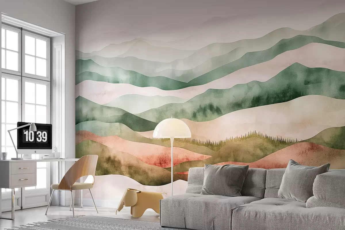 Фотошпалери Акварель гірські пейзажі, ліс, природа, зелений і бежевий кольори w07950v1