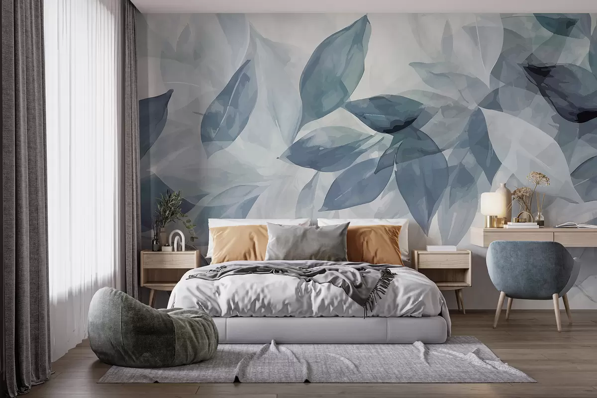 Фотошпалери М'які сіро-білі акварельні листя з розмитим ефірним фоном w07981