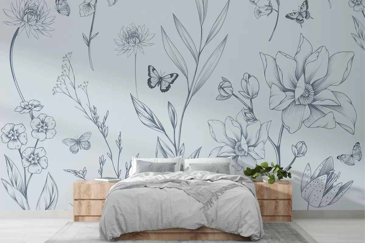 Фотошпалери Бохо монохромні квіти та метелики синього кольору w08088v2