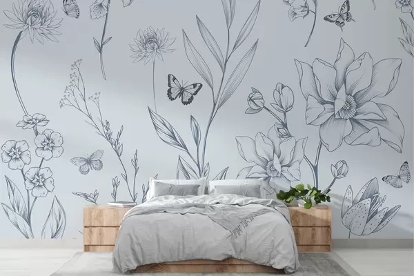 Фотошпалери Бохо монохромні квіти та метелики синього кольору w08088v2