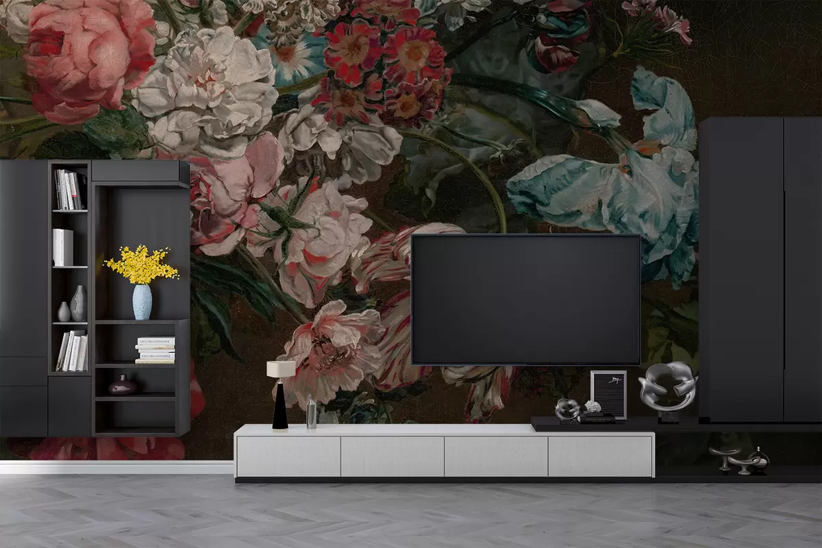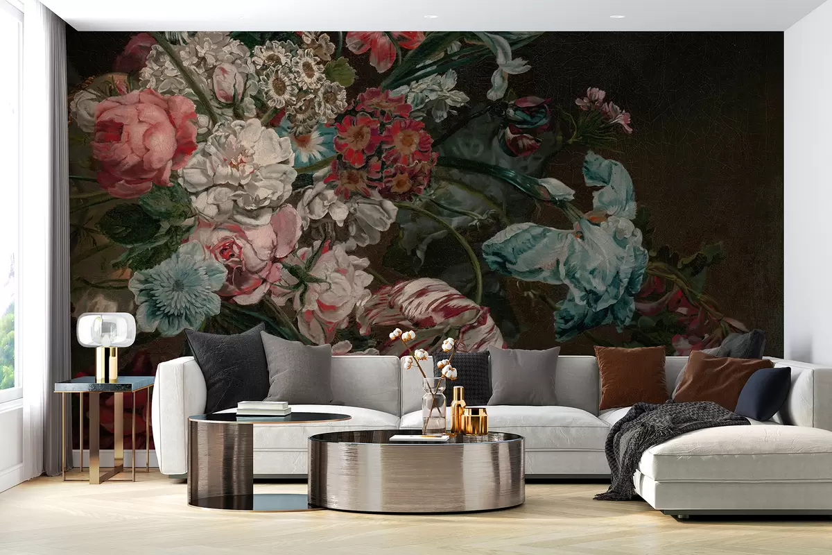 Фотошпалери Вінтажні барвисті квіти, включаючи рожеві півонії, червоні гвоздики та білі лілії на темному тлі w08163