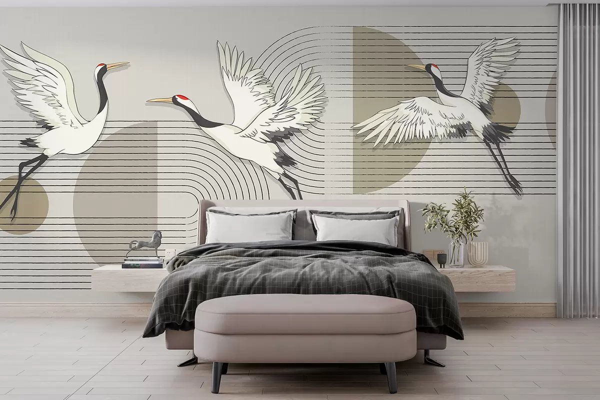 Фотошпалери Три білих журавля в польоті на геометричному мінімалістичному фоні з концентричними колами w08188