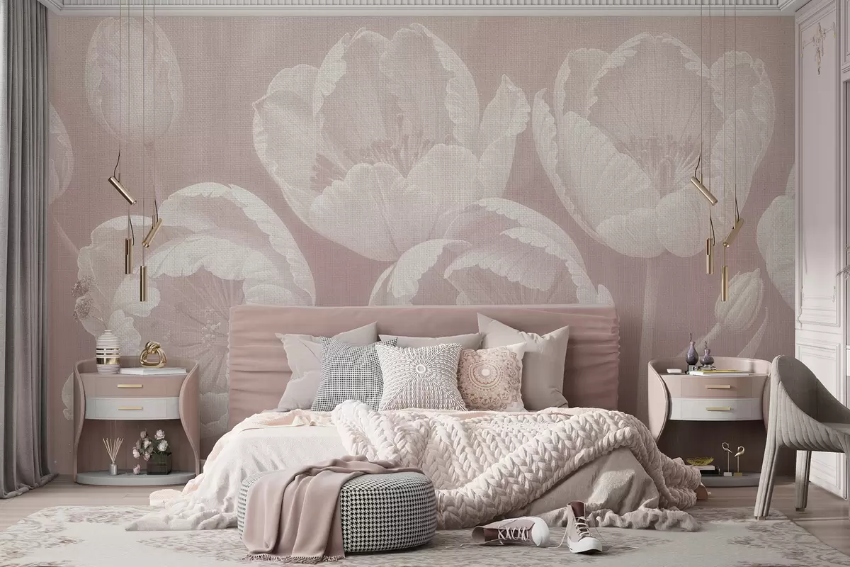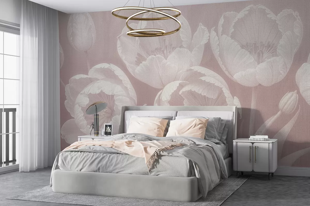 Фотошпалери Малюнок білих тюльпанів з м'яким текстурованим полотном на бежевому розмитому фоні мінімалізм монохромний друк w08193