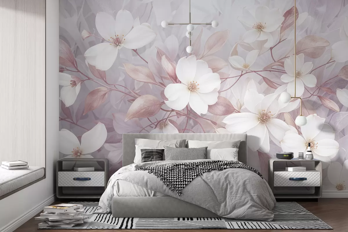 Фотошпалери Ніжні рожеві та білі квіти магнолії, що розквітають на м’яких розмитих гілках на блідому фоні w08196