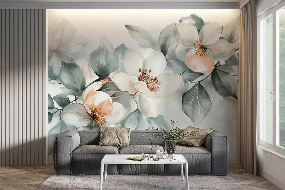 Фотошпалери Ніжні біло-рожеві квіти магнолії з ніжно-зеленим листям на світлому фоні w08220