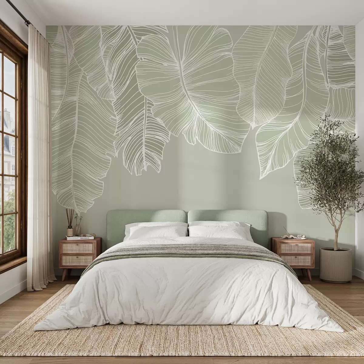 Фотошпалери Біле тропічне квіткове листя з світло-зеленим фоном, мінімалістичний штриховий дизайн w08235v1
