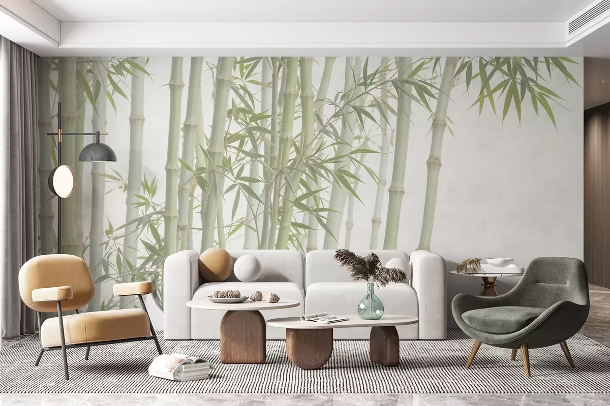 Фотошпалери Густий бамбуковий ліс із високими бамбуковими стеблами та зеленим листям на м’якому туманному фоні w08237