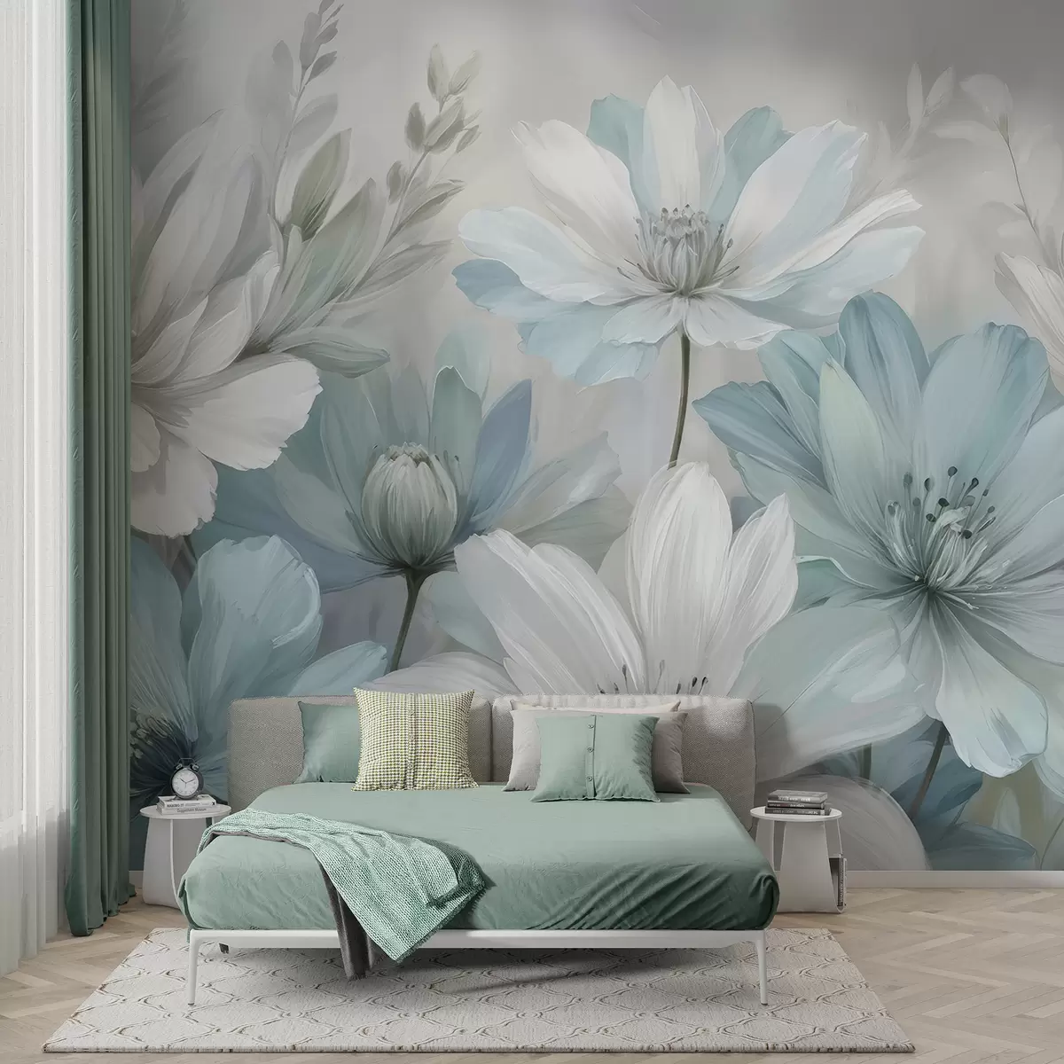 Фотошпалери Крупний план білих і світло-блакитних квітів, схожих на ромашку, з м’яким розмитим фоном w08247