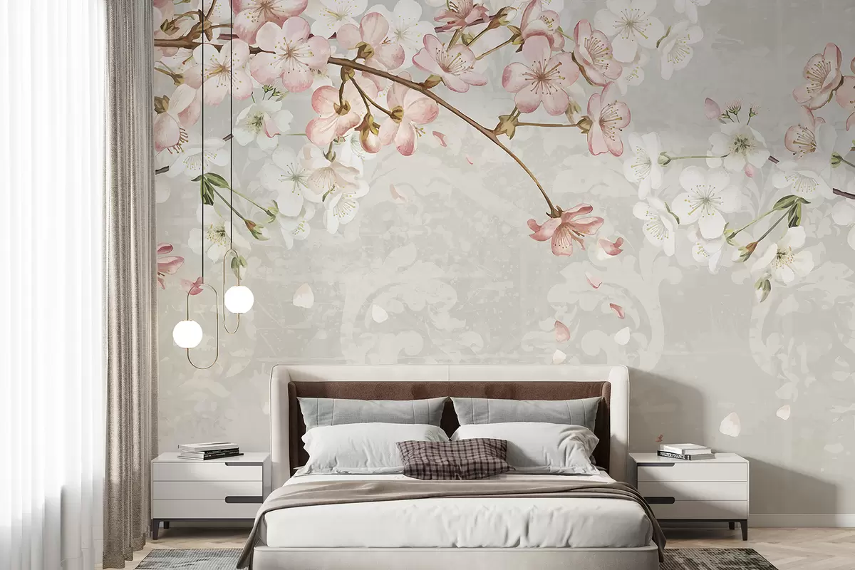 Фотошпалери Рожеві та білі квіти вишні в повному розквіті, з м'якими пелюстками, що спадають на фактурному бежевому тлі w08254v1