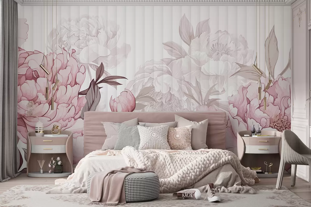 Фотошпалери Крупним планом великі, ніжні рожеві та білі квіти півонії на м'якому, фактурному тлі w08255