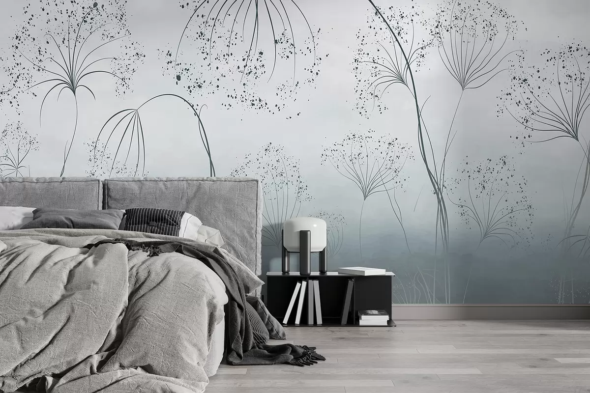 Фотошпалери Сині високі, кучеряві рослини з ніжними, парасолькоподібними квітами або насіннєвими головками в туманному, атмосферному середовищі w08258v1