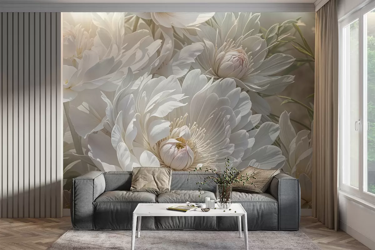 Фотошпалери Крупним планом великі, ніжні білі квіти півонії з м'якими, пухнастими пелюстками та блідо-жовтими серединками w08325