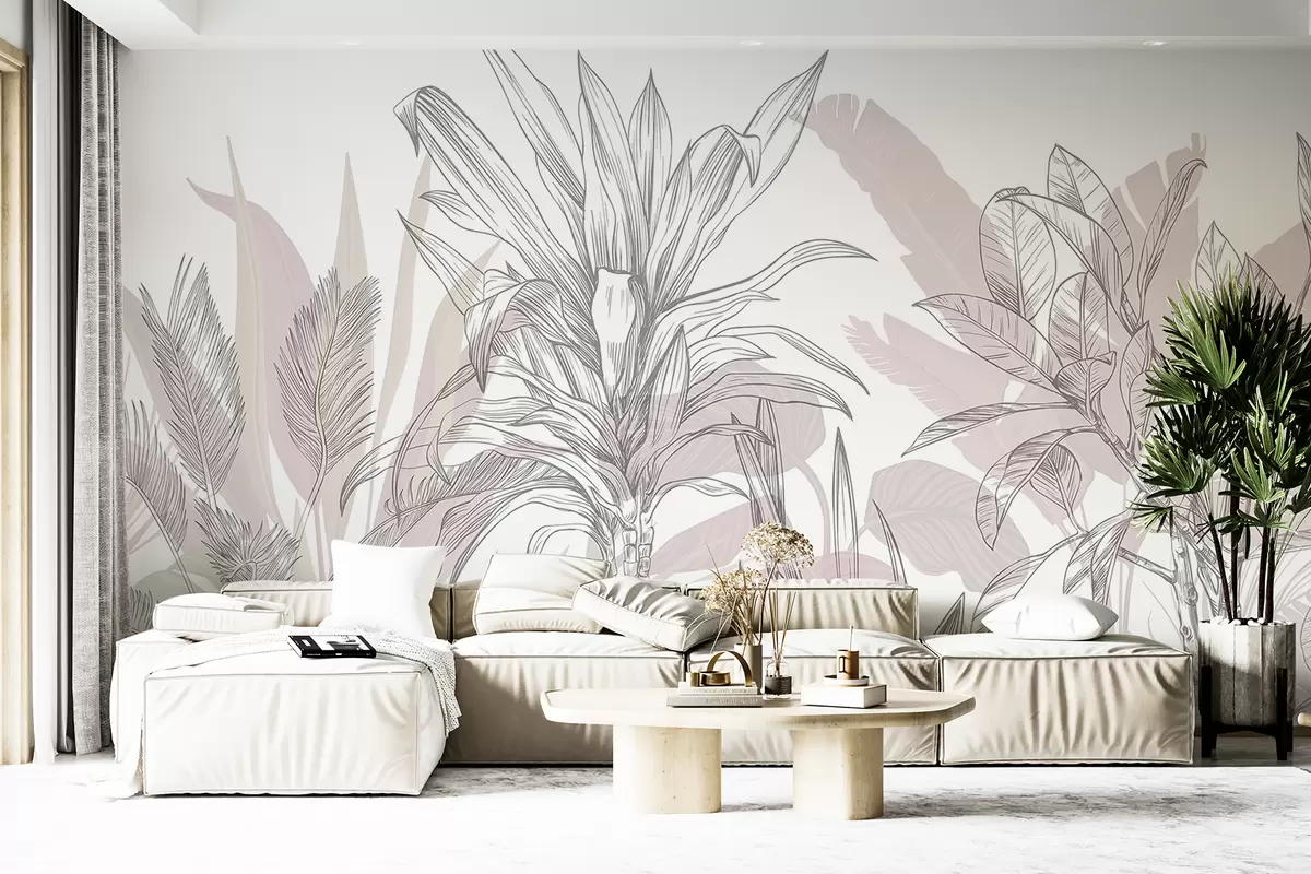 Фотошпалери Тропічні графічні рослини з великим пишним листям і квітами у відтінках сірого і білого з квітковими рожевими силуетами w08327v1