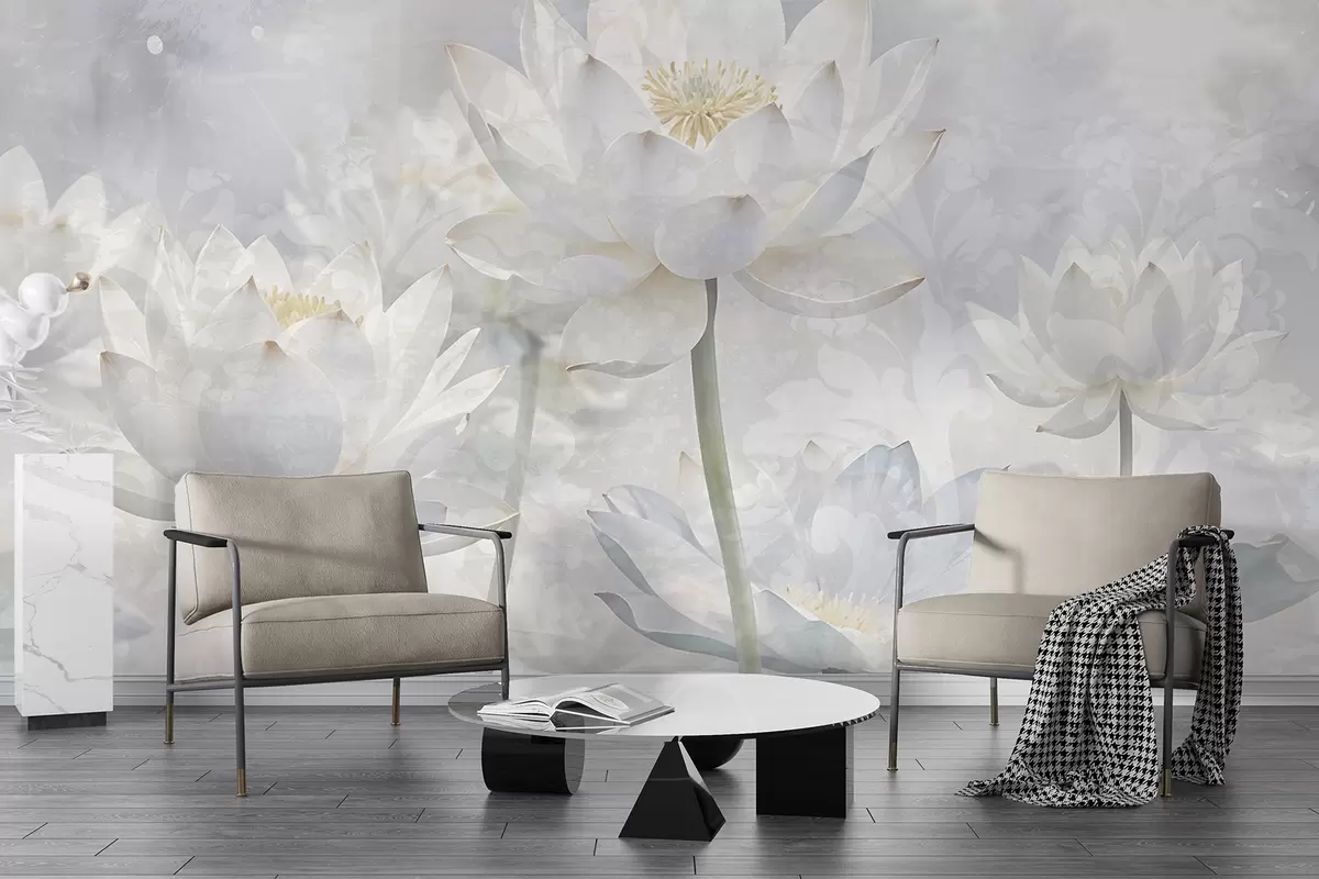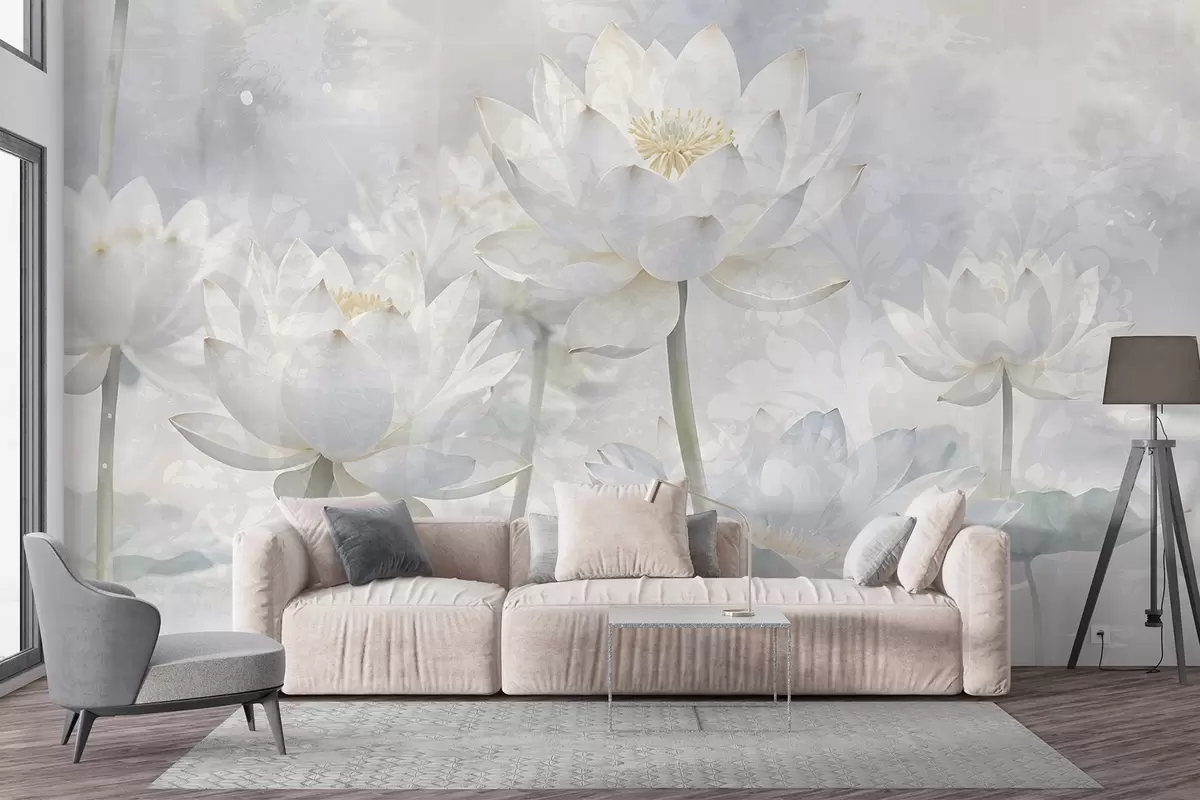 Фотошпалери Білі квіти лотоса на туманному, ефірному абстрактному пастельному тлі пастельного пейзажу w08328