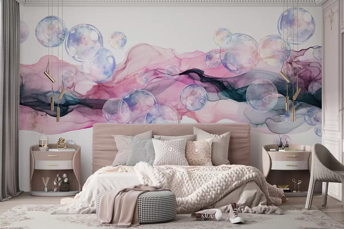 Фотошпалери Барвисті абстрактні форми рідини з бульбашками, вихорами рожевих, блакитних і фіолетових відтінків на білому тлі w08337