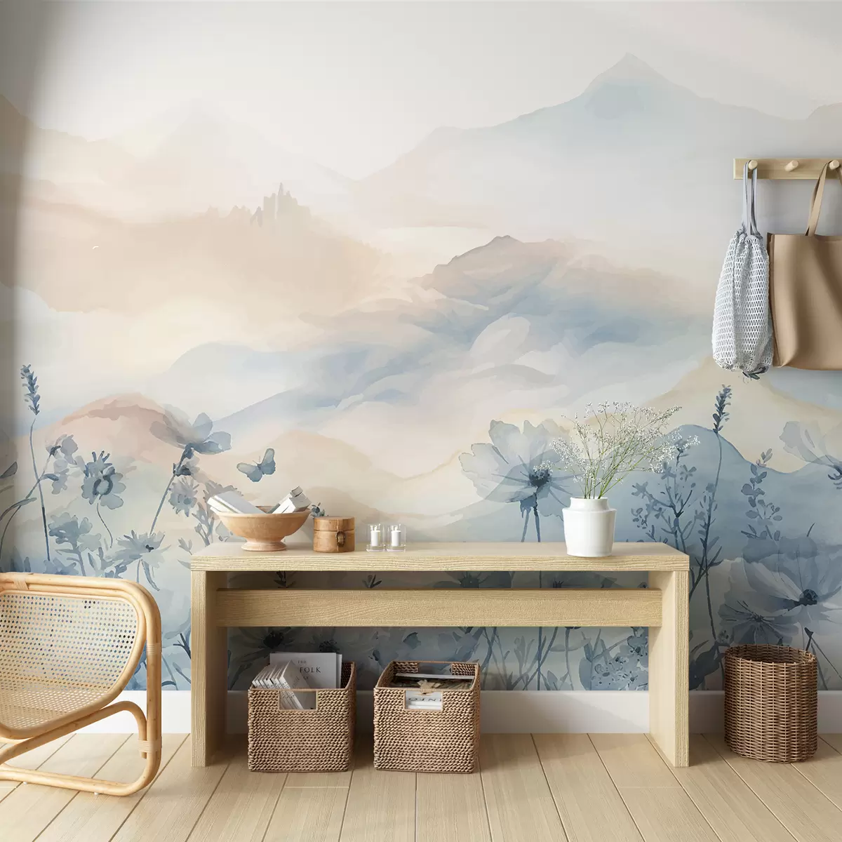 Шпалери Безтурботний пейзаж з туманним гірським хребтом на задньому плані, оточений полем ніжних блакитних квітів w08339