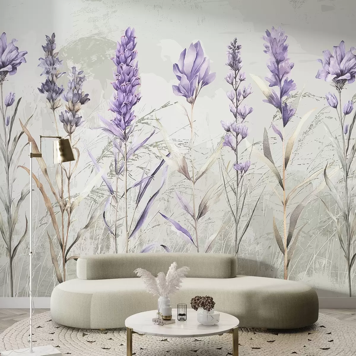 Фотошпалери Поле фіолетових акварельних квітів лаванди на м'якому, розмитому фактурному бежевому тлі w08346