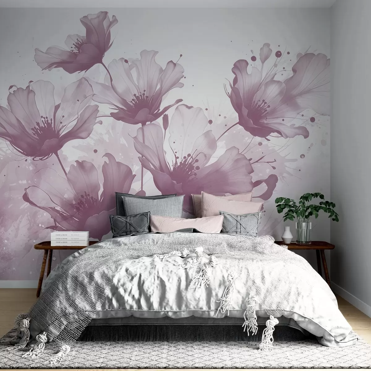 Фотошпалери Ніжно-рожеві квіти з м'якими, розмитими пелюстками та акварельними бризками на світлому тлі w08376v2