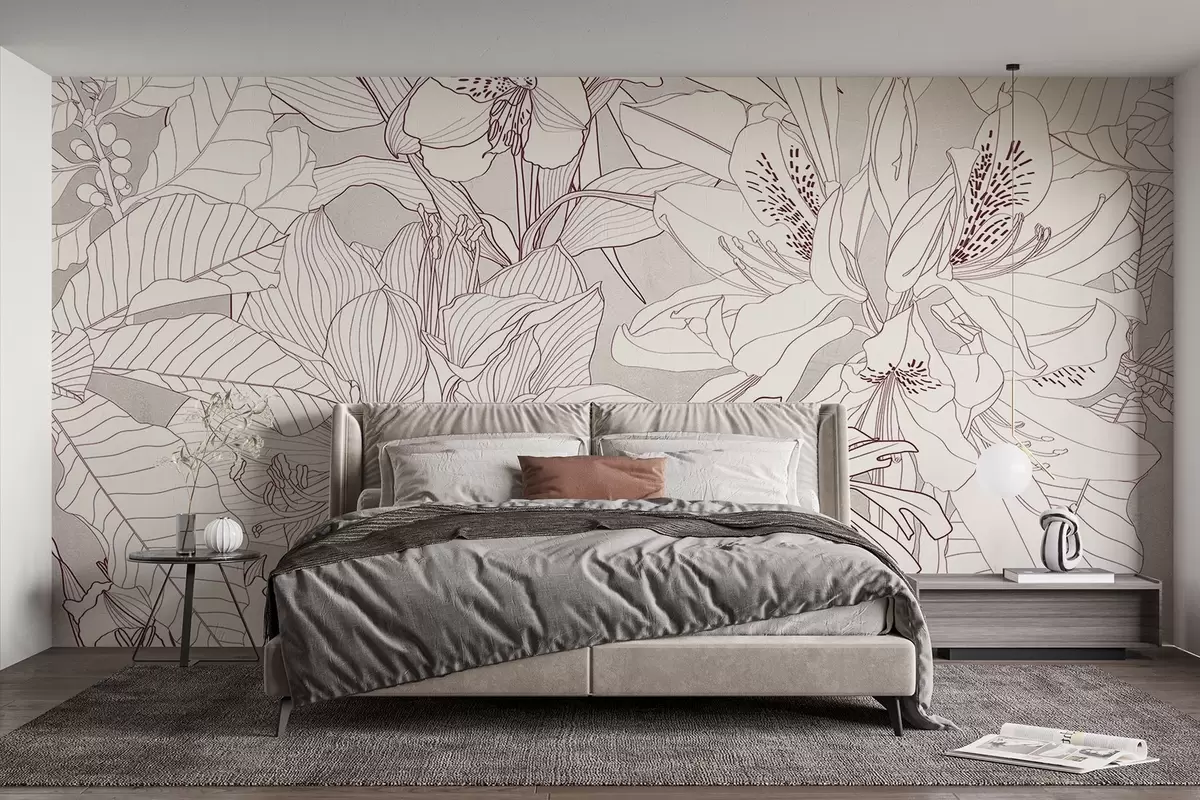 Фотошпалери Детальний бордо і сірий квітковий принт з різними видами квітів і листя, пишний, складний ботанічний дизайн w08385