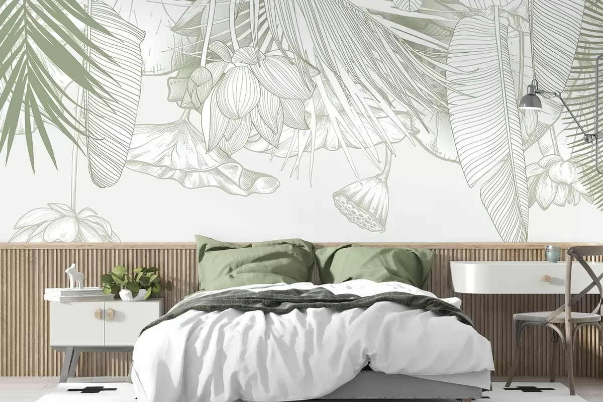 Фотошпалери Крупний план зеленого квіткового принту з великими пелюстками та листям, що накладаються одна на одну, в монохромному кольорі w08389v1