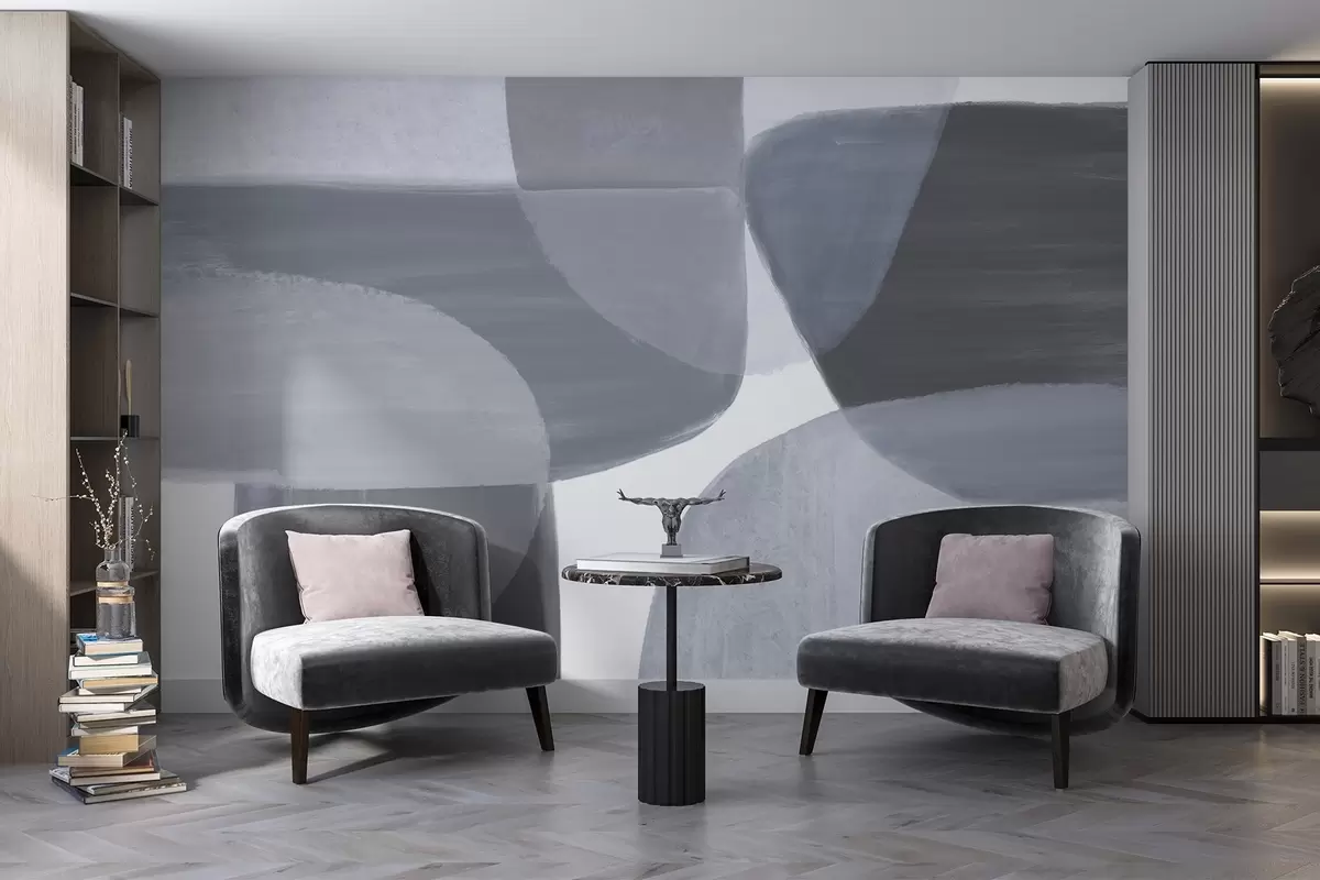 Фотошпалери Монохромний абстрактний принт з мінімалістичними формами, що накладаються одна на одну, у відтінках сірого та синього w08410