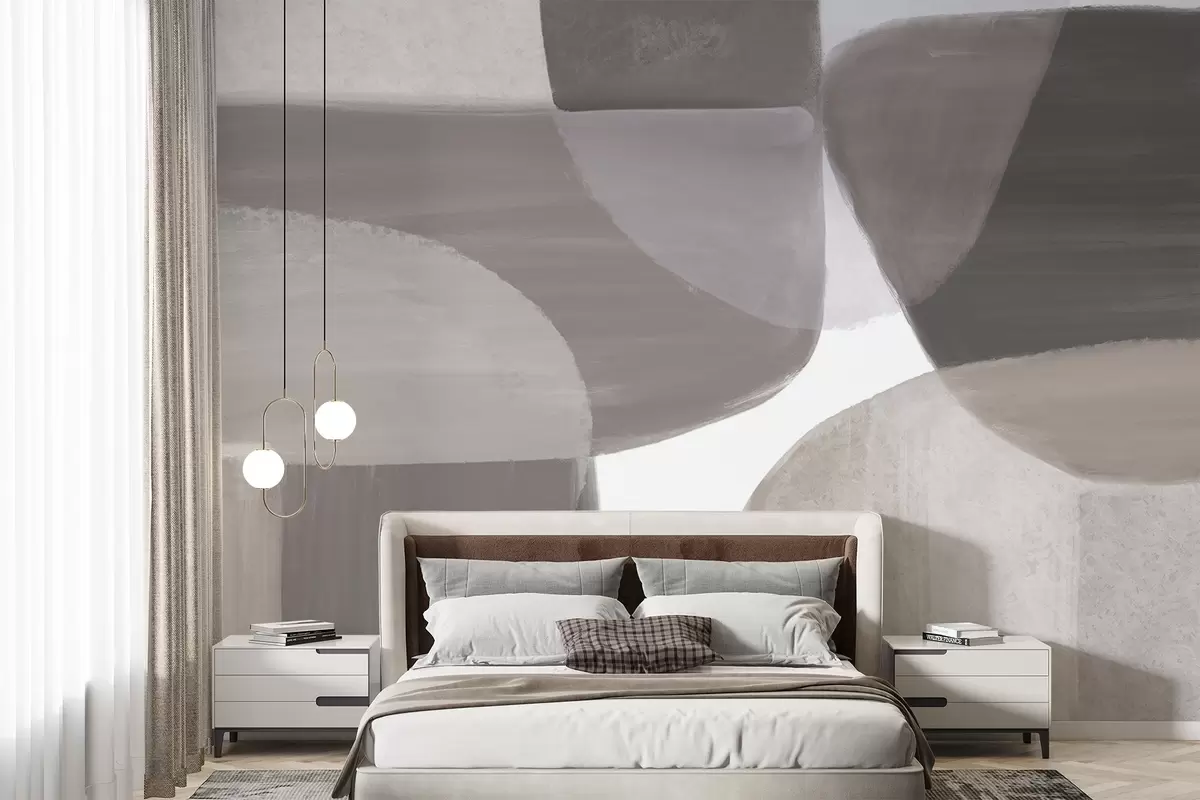 Фотошпалери Монохромний абстрактний принт з мінімалістичними формами, що накладаються одна на одну, у відтінках сірого та бежевого w08410v1