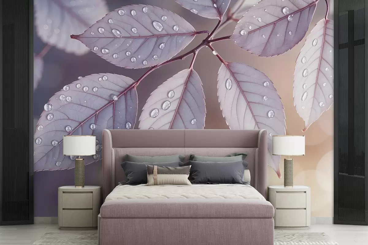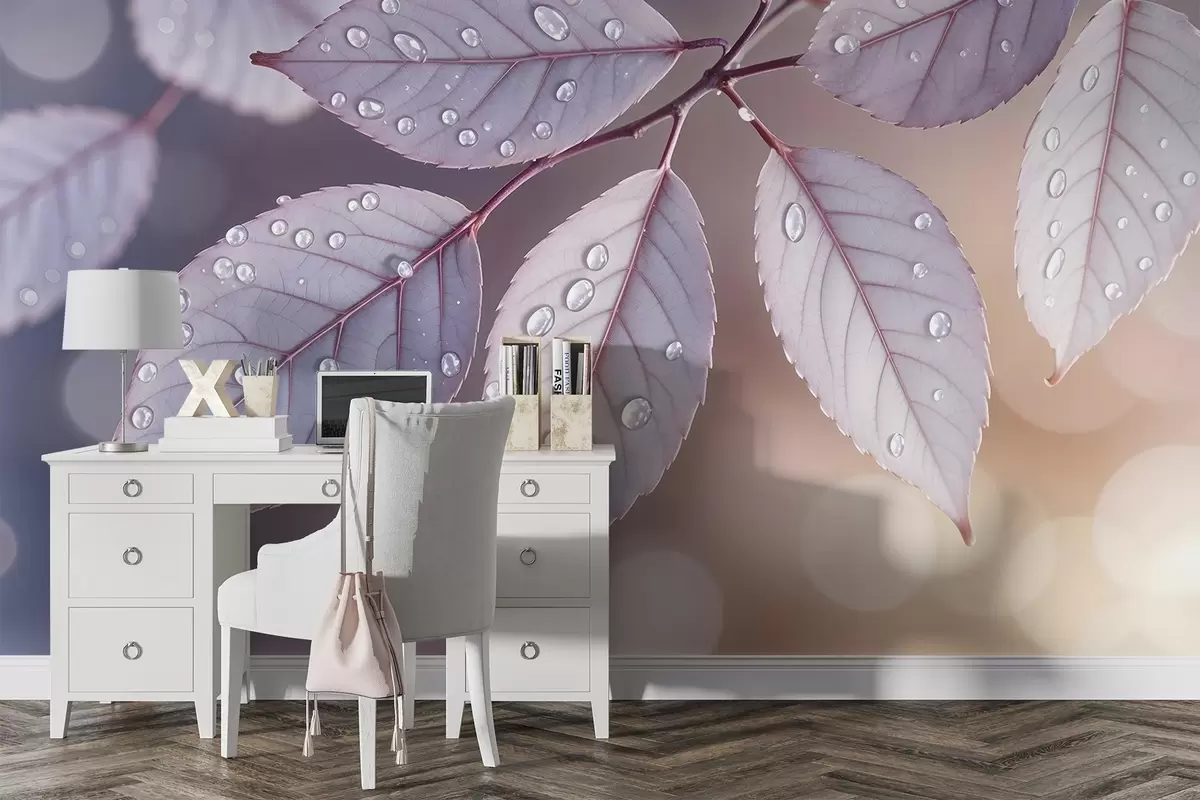 Фотошпалери Ніжне фіолетове листя з крапельками води, м'який фокус на тлі w08419