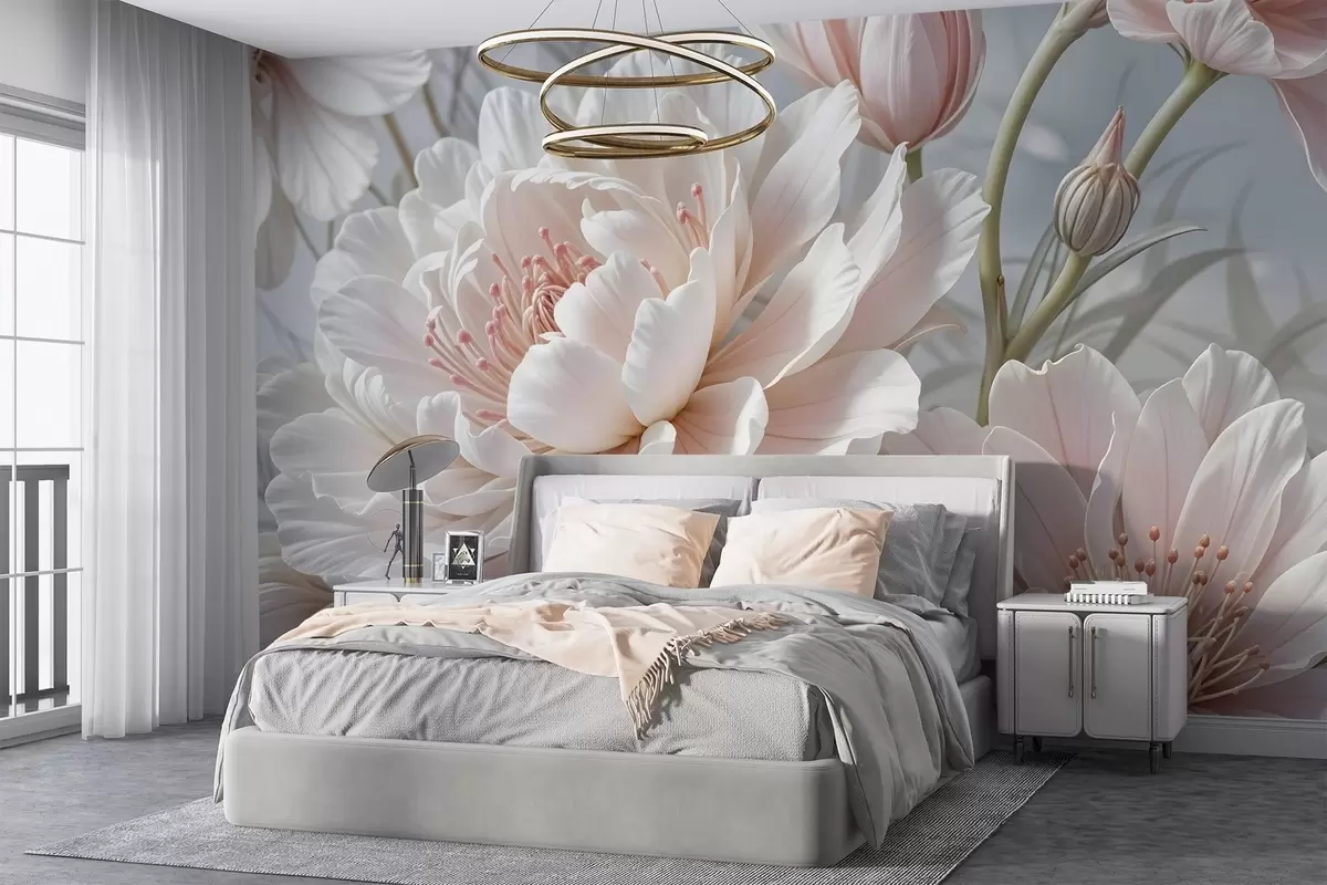 Фотошпалери Великі, ніжні білі та рожеві квіти півонії з м'якими, пухнастими пелюстками на розмитому сірому тлі w08427
