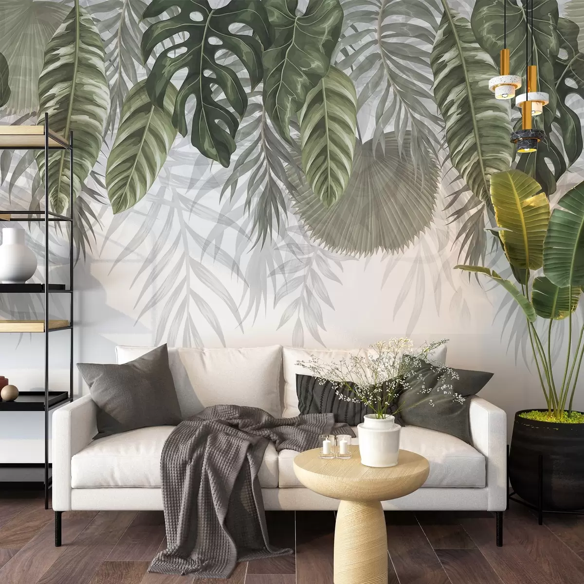 Фотошпалери Тропічне листя у відтінках зеленого, включаючи велике листя монстери та пальмове листя на білому тлі w08443