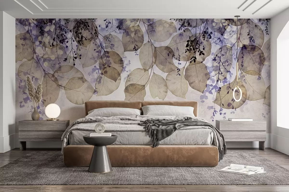 Фотошпалери Ніжне засушене листя та квіти у відтінках фіолетового, бежевого та білого на світлому фактурному тлі w08447