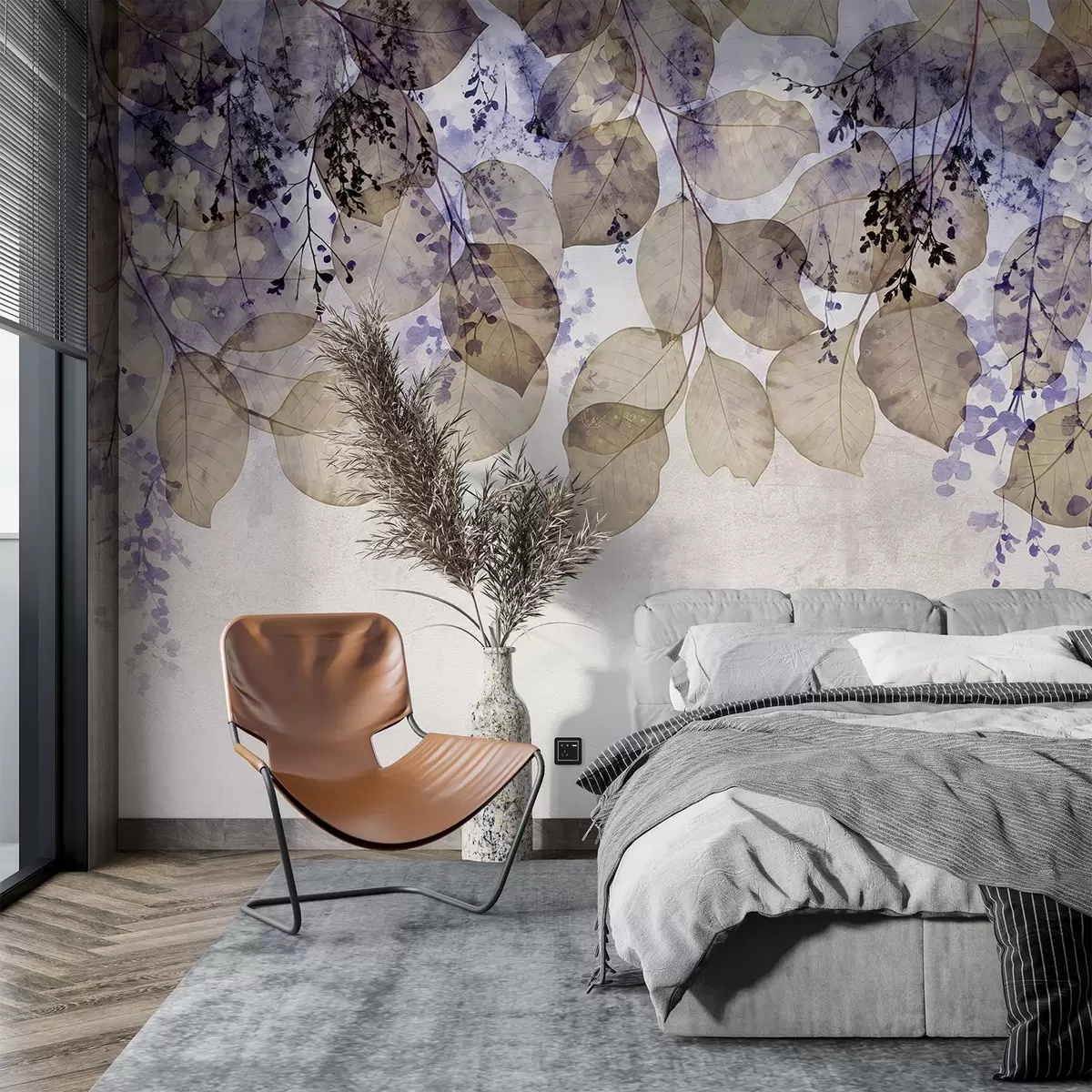 Фотошпалери Ніжне засушене листя та квіти у відтінках фіолетового, бежевого та білого на світлому фактурному тлі w08447