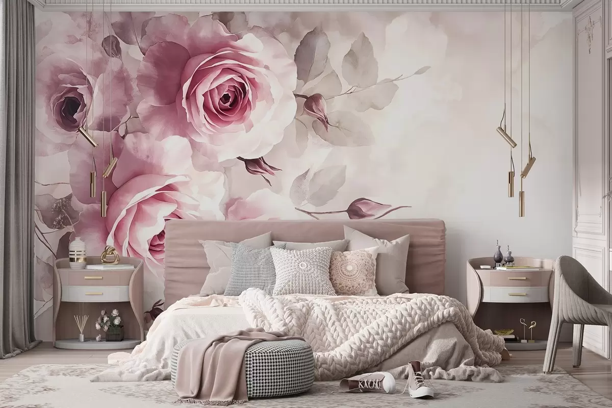 Шпалери Ніжні пастельно-рожеві троянди та листя на м'якому, розмитому тлі, що імітує акварель w08459