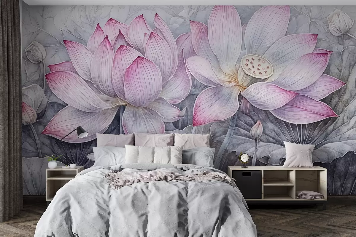 Фотошпалери Кілька деталізованих фактурних великих рожевих квіток лотоса з сіро-зеленим листям і стеблами на світлому тлі w08465