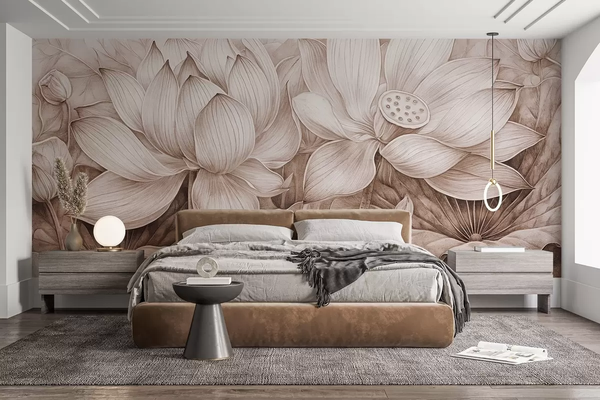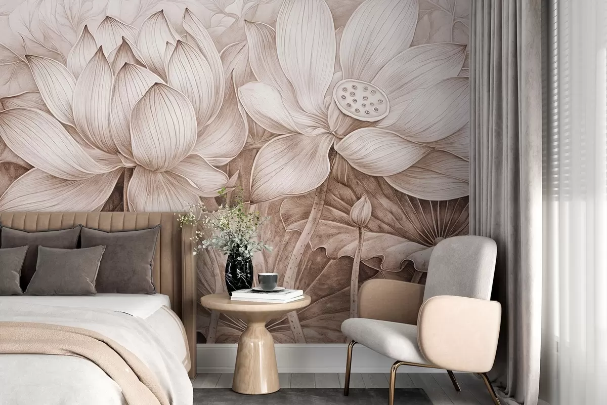 Фотошпалери Кілька деталізованих фактурних великих бежевих квіток лотоса з коричневим листям і стеблами на світлому тлі w08465v1